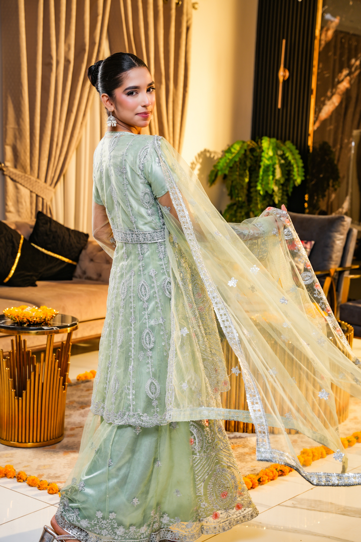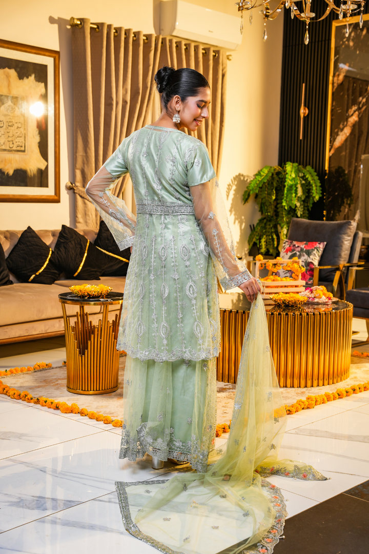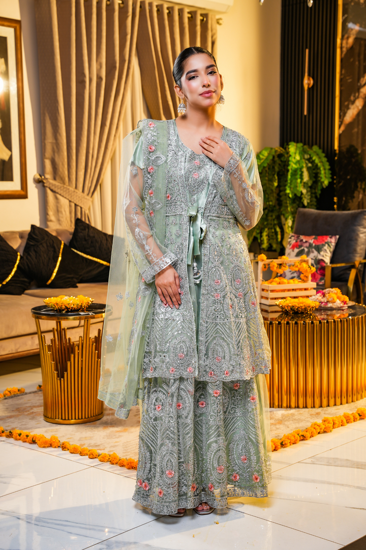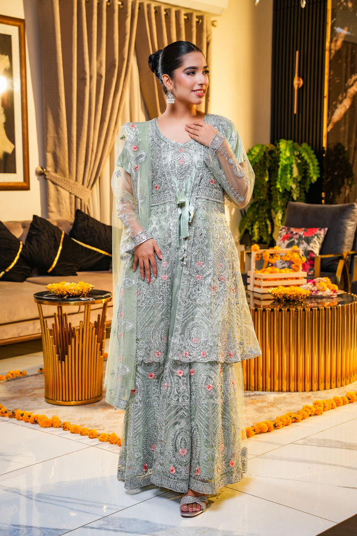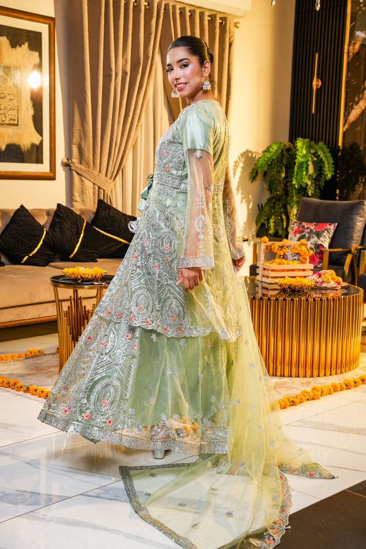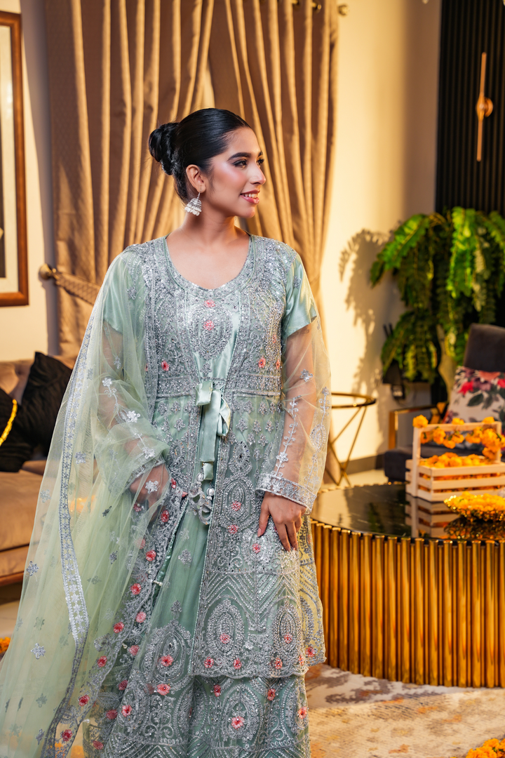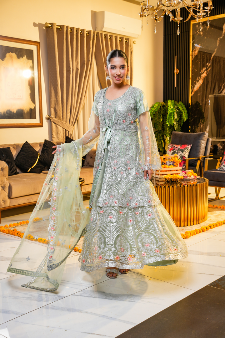Soft aqua green tone, this gown features silver toned embroidery on the dress, sleeves, dupatta, and pouch. The tie rope belt adds a flattering fit, while the net dupatta completes the look, perfect for festive evenings and graceful gatherings.