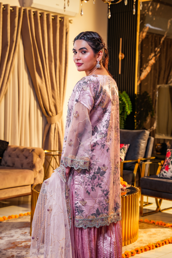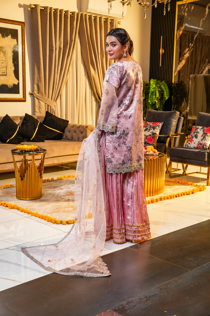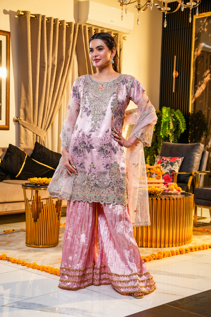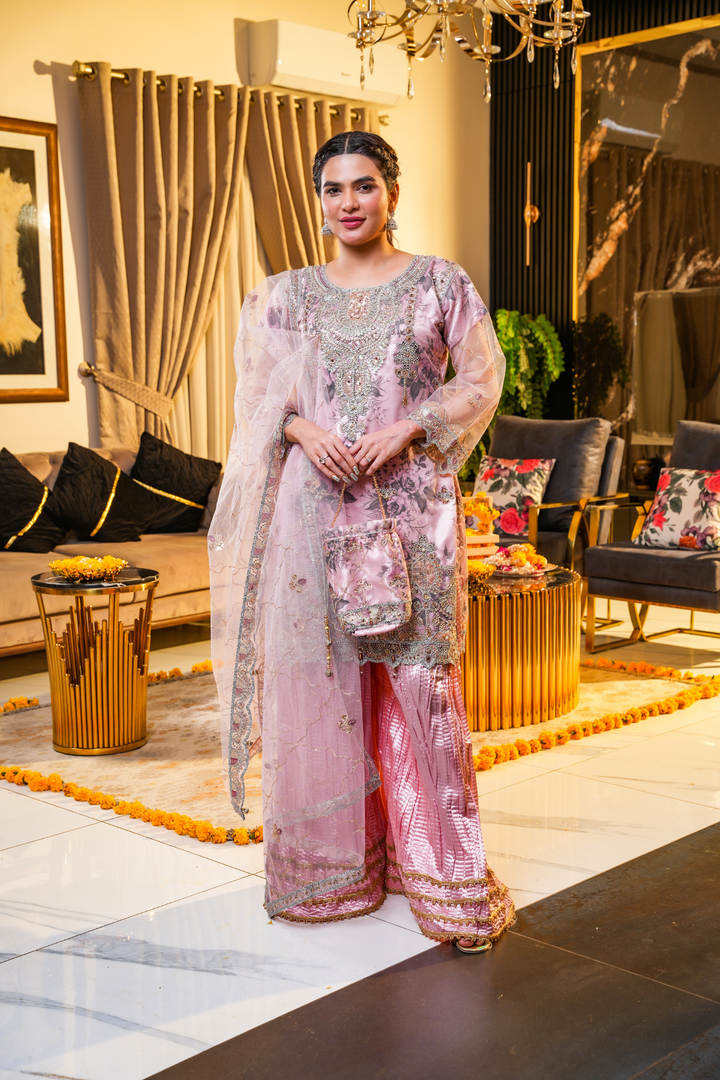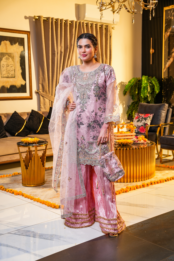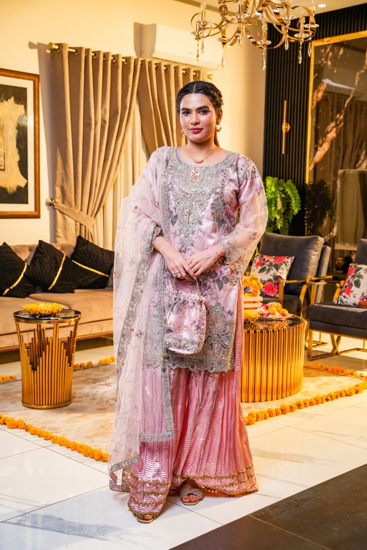 Blush Dusk from Designer Art’s Sitare Collection brings together soft pink tones with intricate silver embroidery. The ghagra features detailed work on the dress, sleeves, dupatta, and pouch, paired with a dark grey floral print and crush shalwar bottom embroidery, perfect for festive evenings and wedding celebrations.