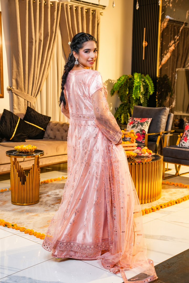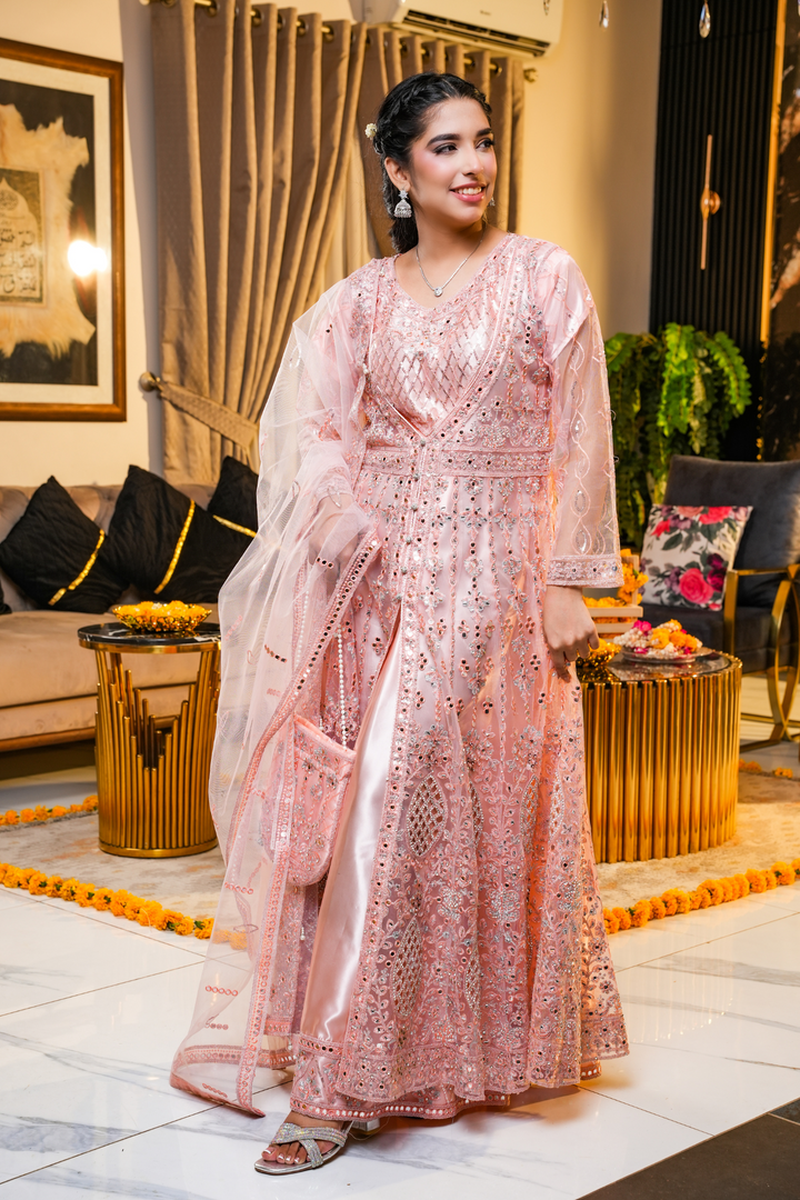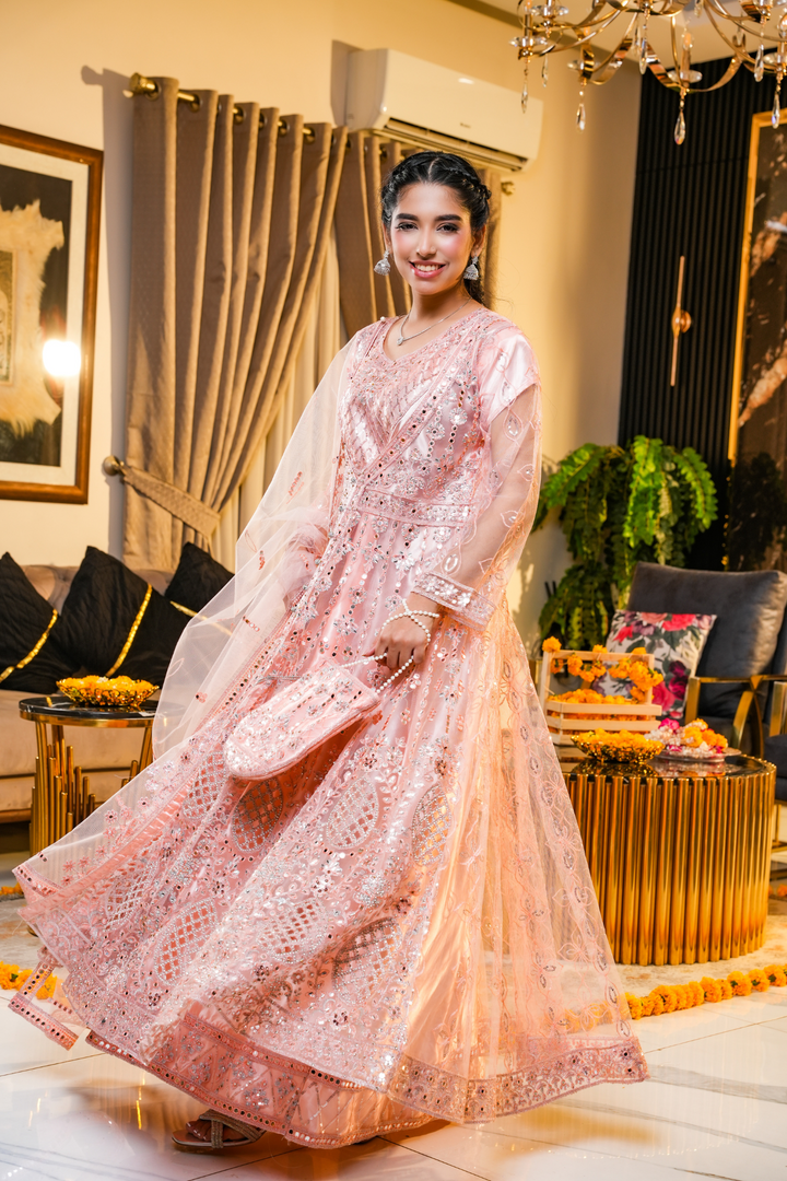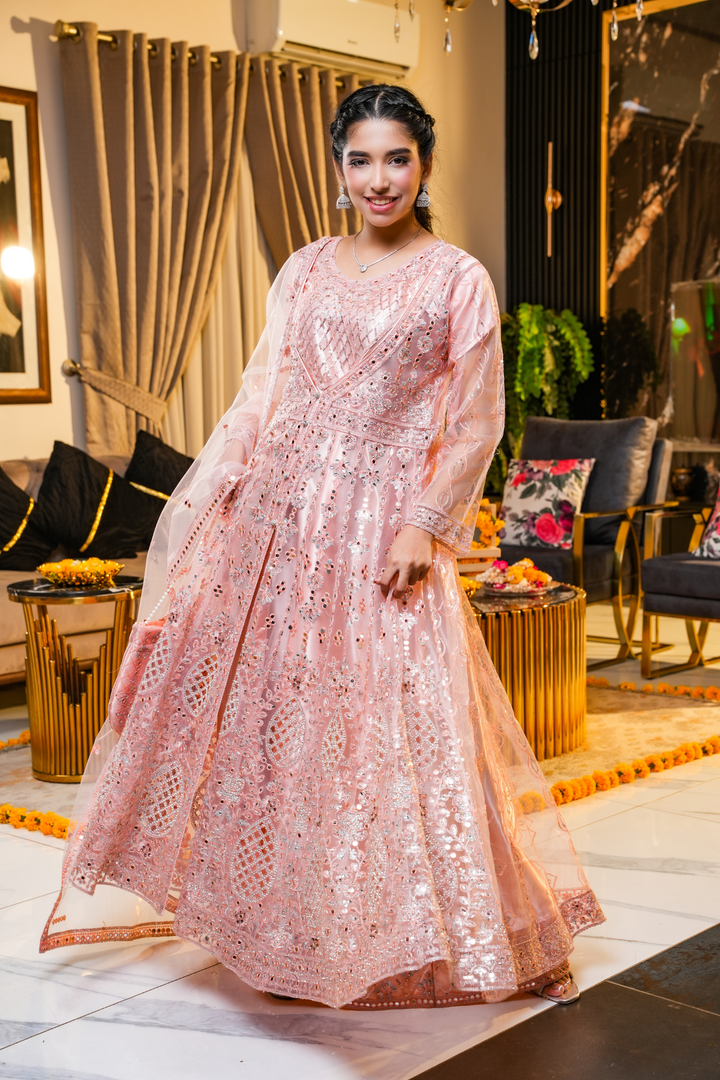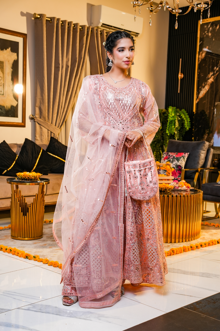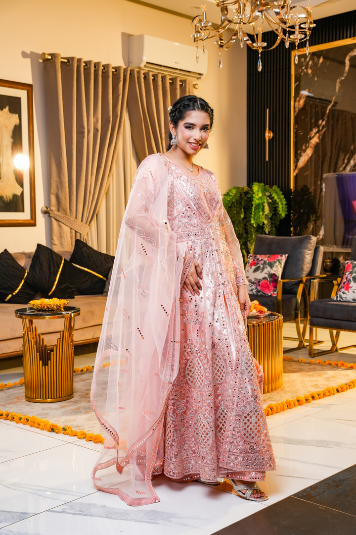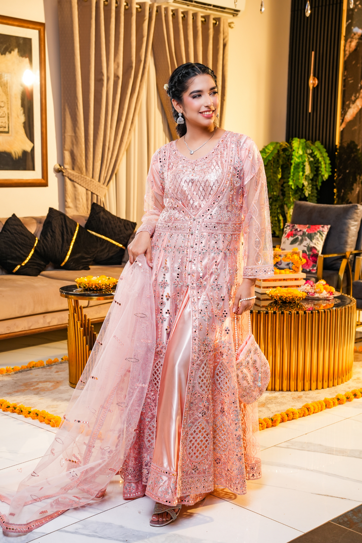This vibrant bright pink dress comes with detailed embroidery on the dress, sleeves, dupatta, and pouch. Paired with a soft net dupatta and a graceful split cut bottom, it’s made for celebrations that call for color and confidence.