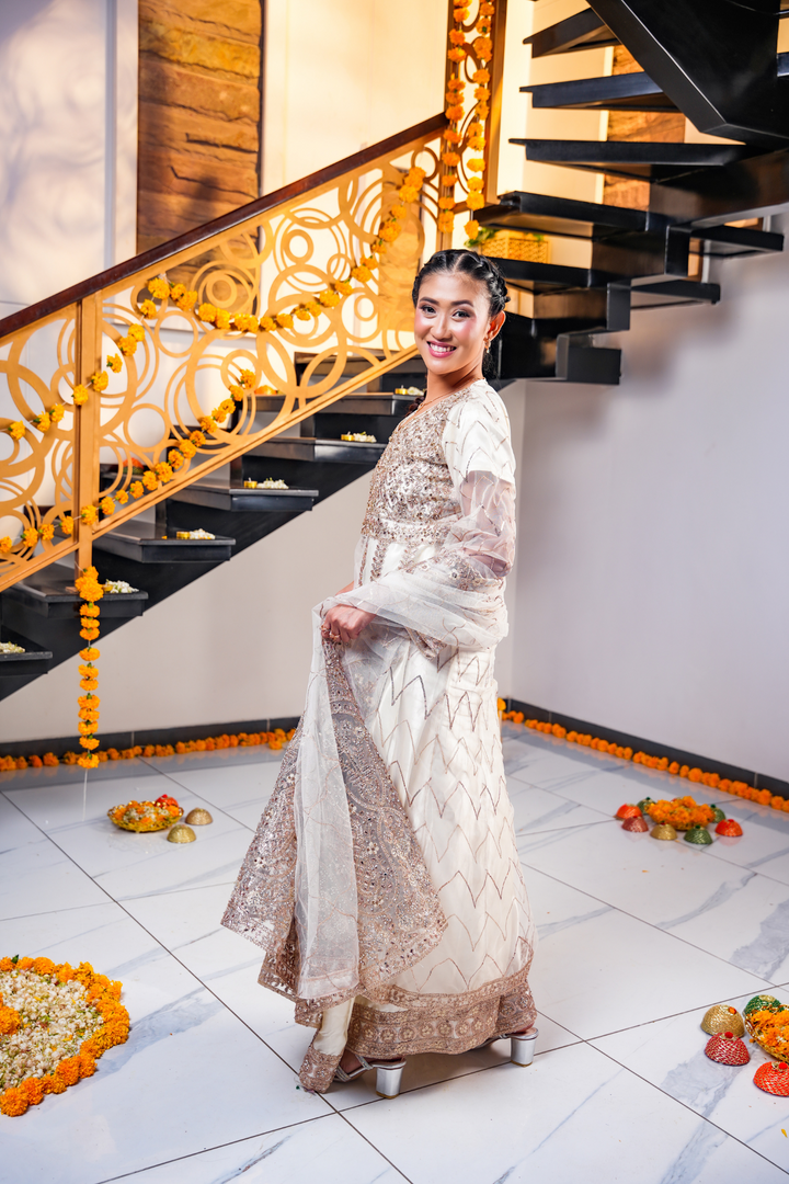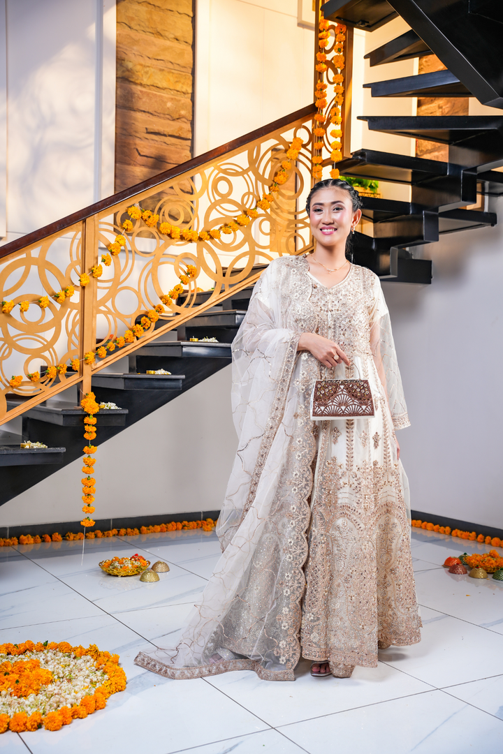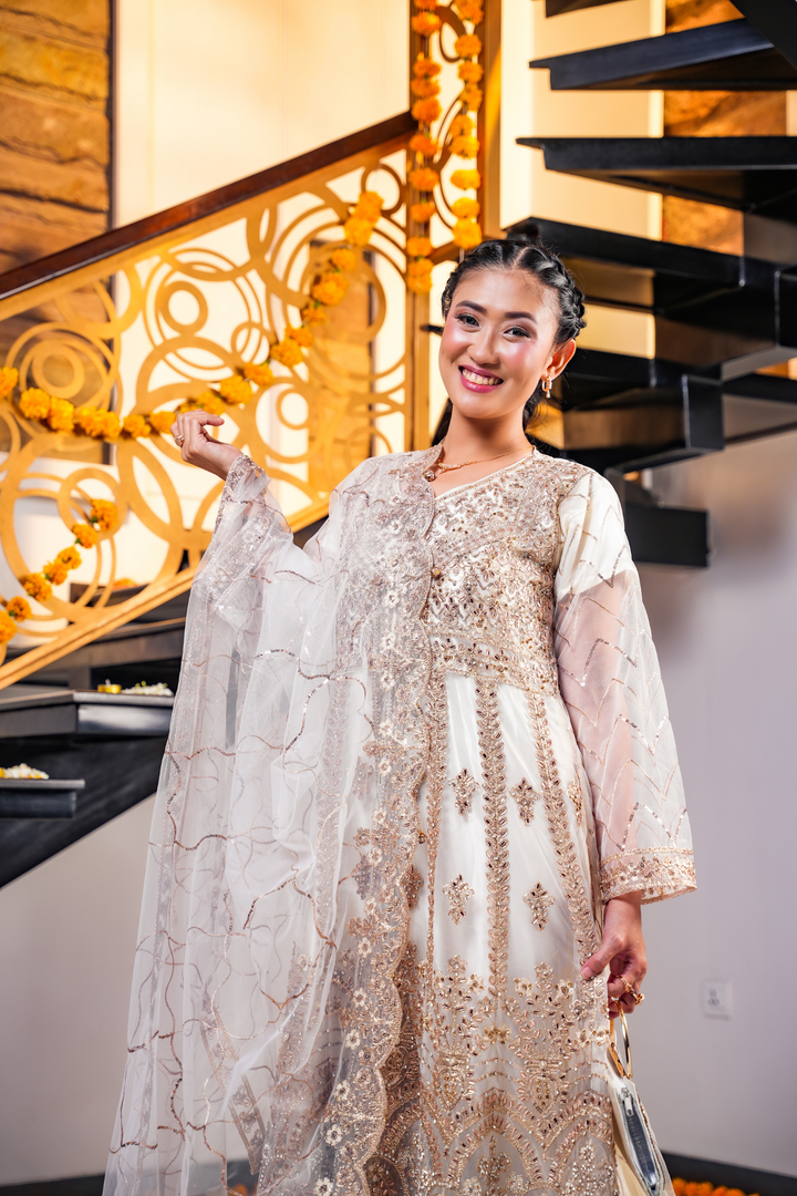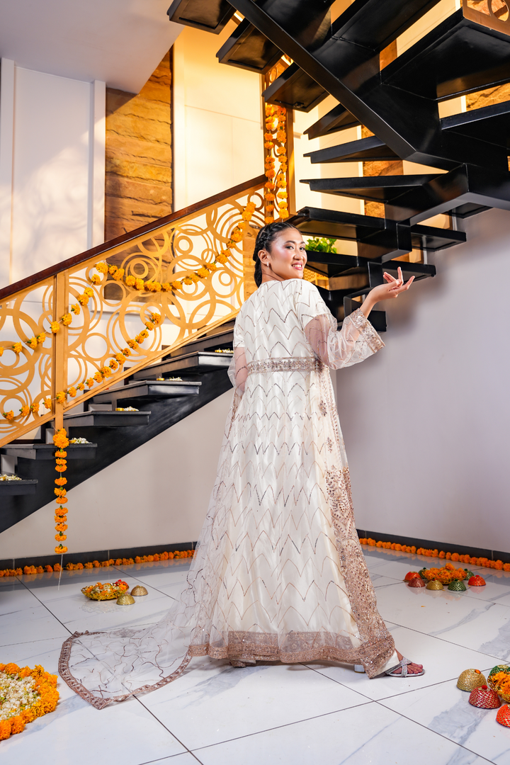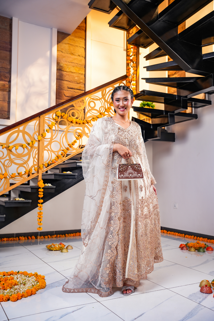 This white outfit features intricate golden and light copper embroidery on the dress, dupatta, and purse with a chic copper handle. Designed with a bottom open cut and complemented by a soft net dupatta, it’s crafted for statement festive wear.