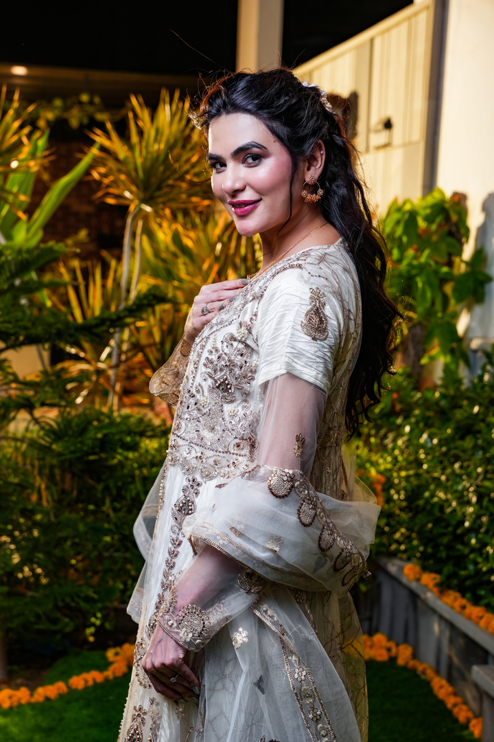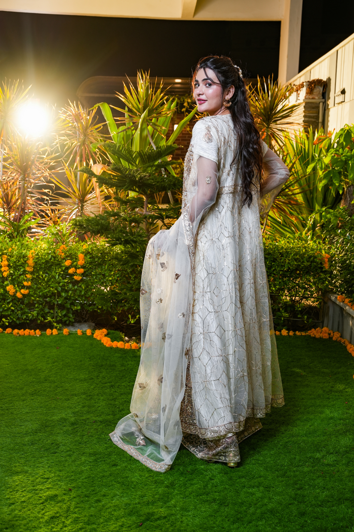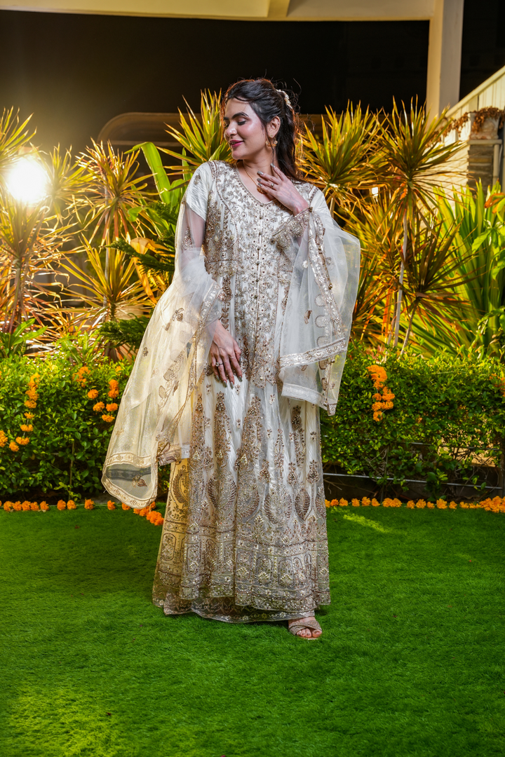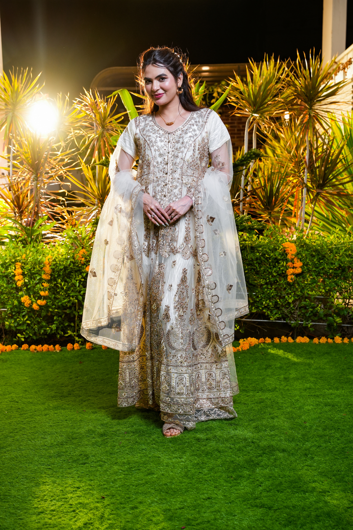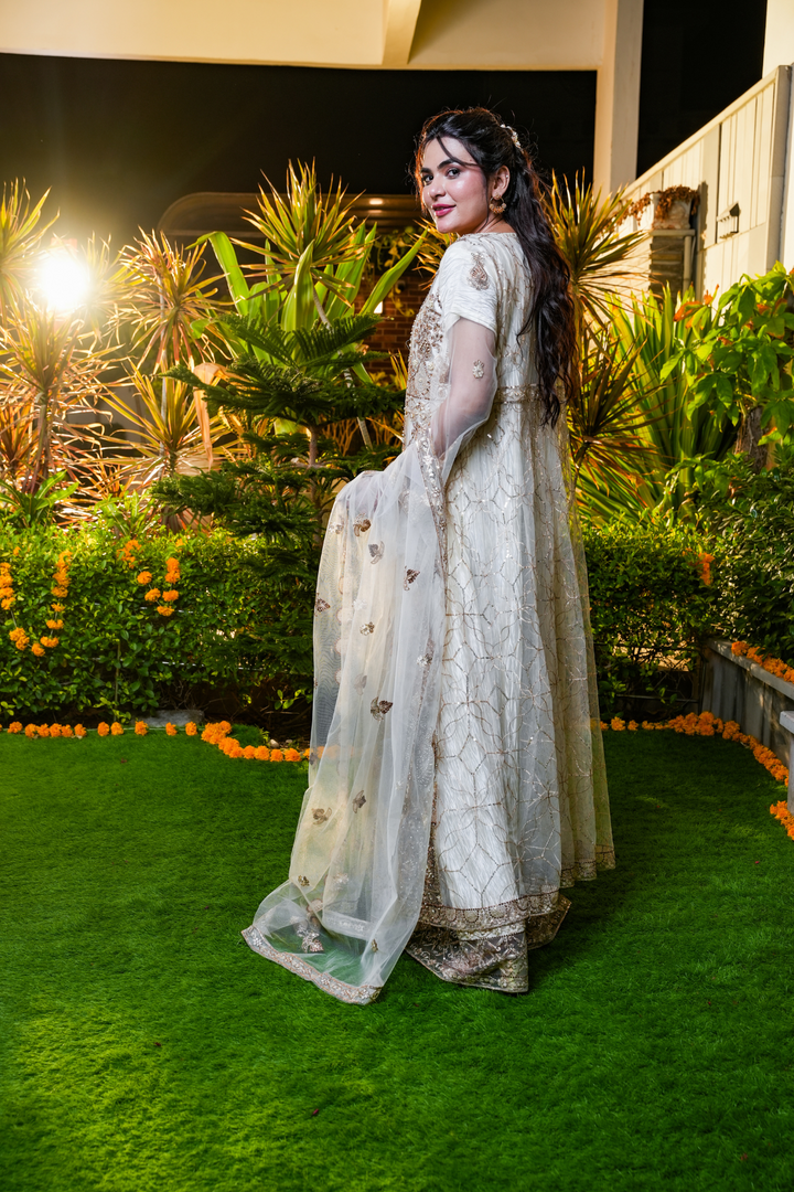 From our Diva Collection, this white outfit features golden and light copper embroidery on the front and sleeves. Designed with a bottom open cut and paired with a delicate net dupatta and matching pouch, it’s a timeless festive piece