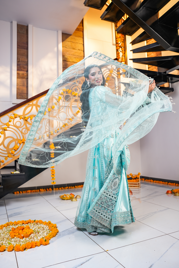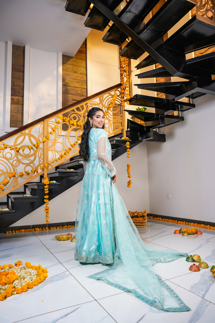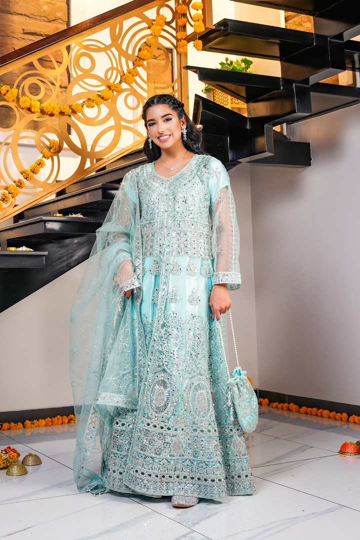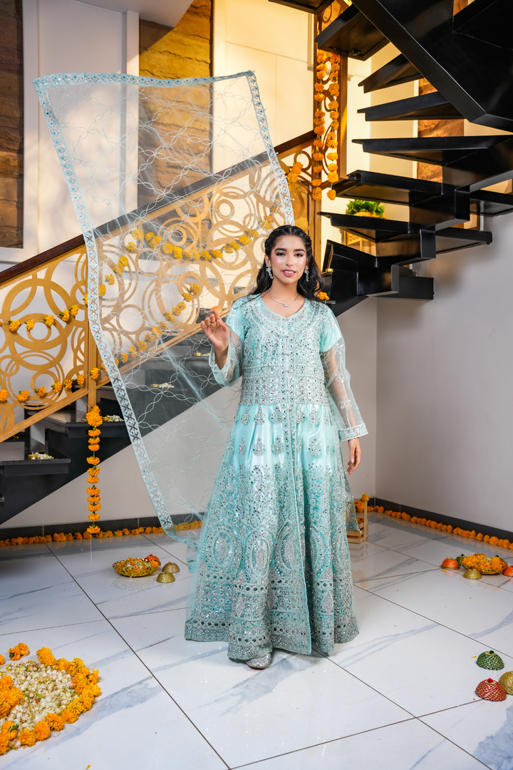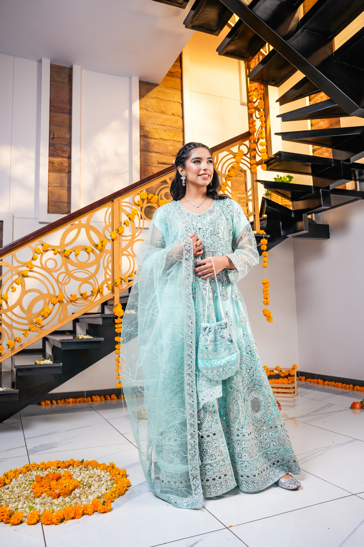 A beautiful pastel blue outfit from our Diva Collection with delicate embroidery on the dress, dupatta, and pouch. Perfect for weddings, festive events, and special gatherings. Comes with a net dupatta and a stylish bottom open cut design.