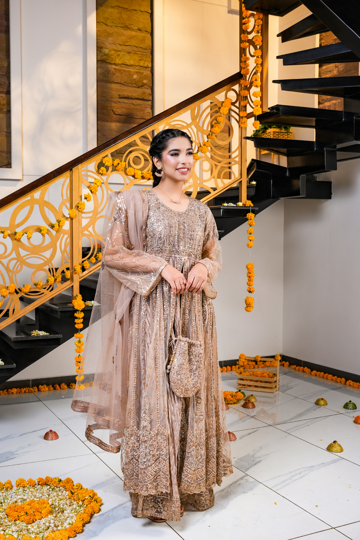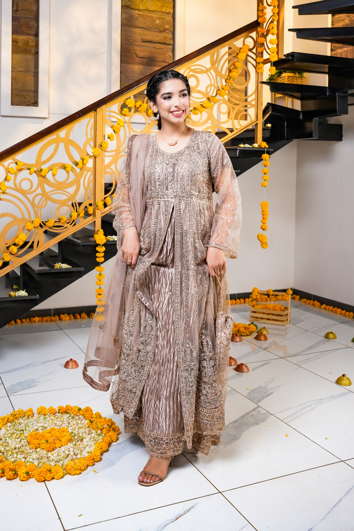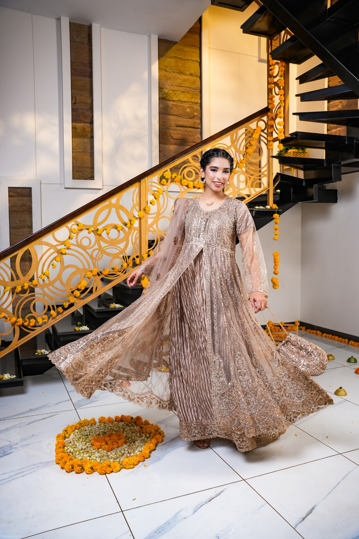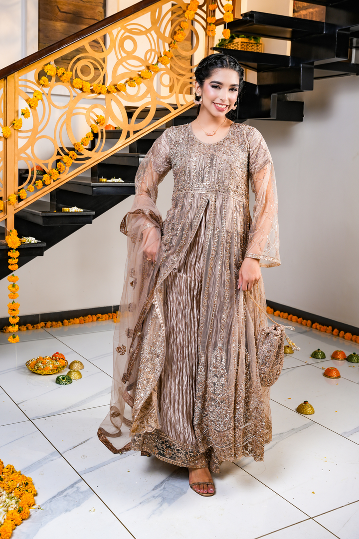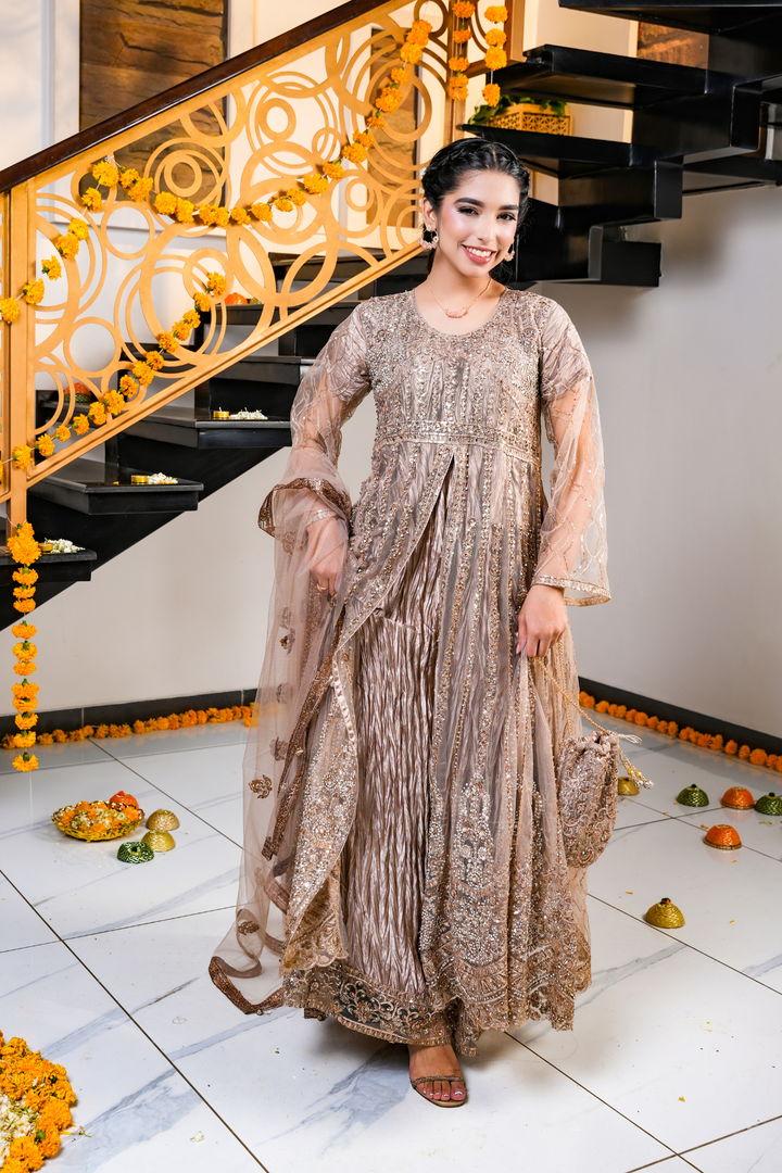 This champagne brown dress features detailed gold and copper embroidery on the dress, pouch, and net dupatta. Designed with a bottom split style, it’s perfect for festive events, weddings, and evening celebrations.