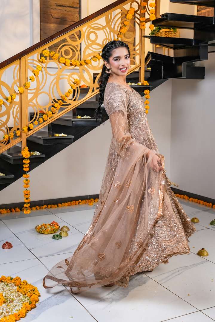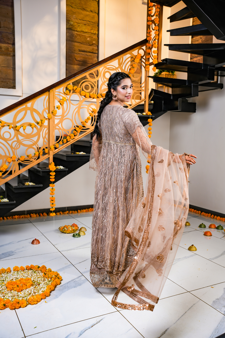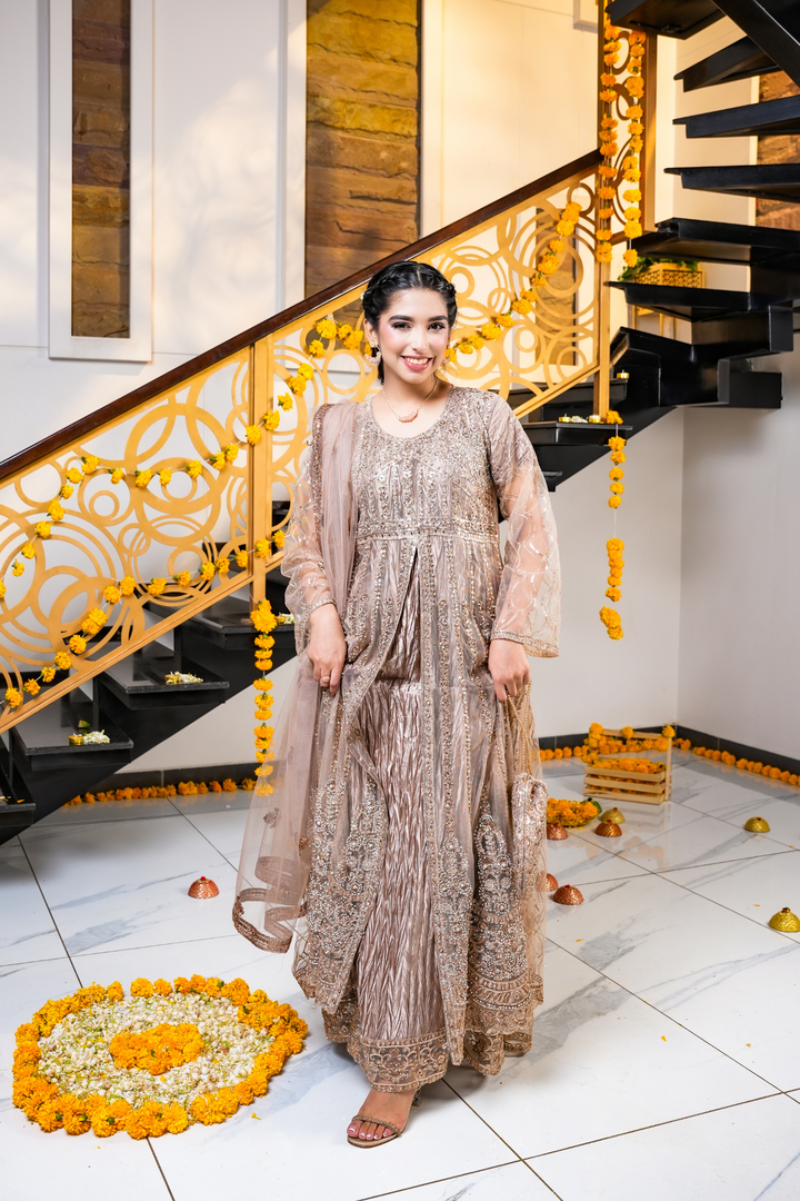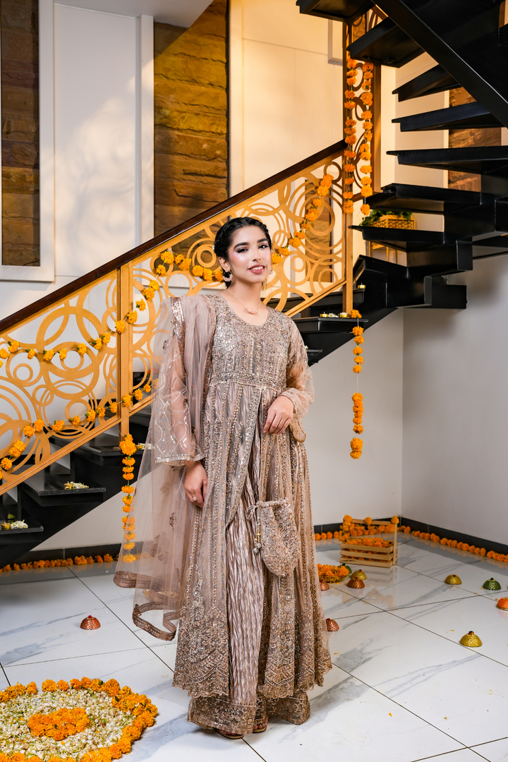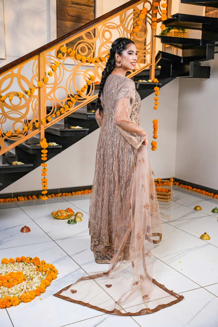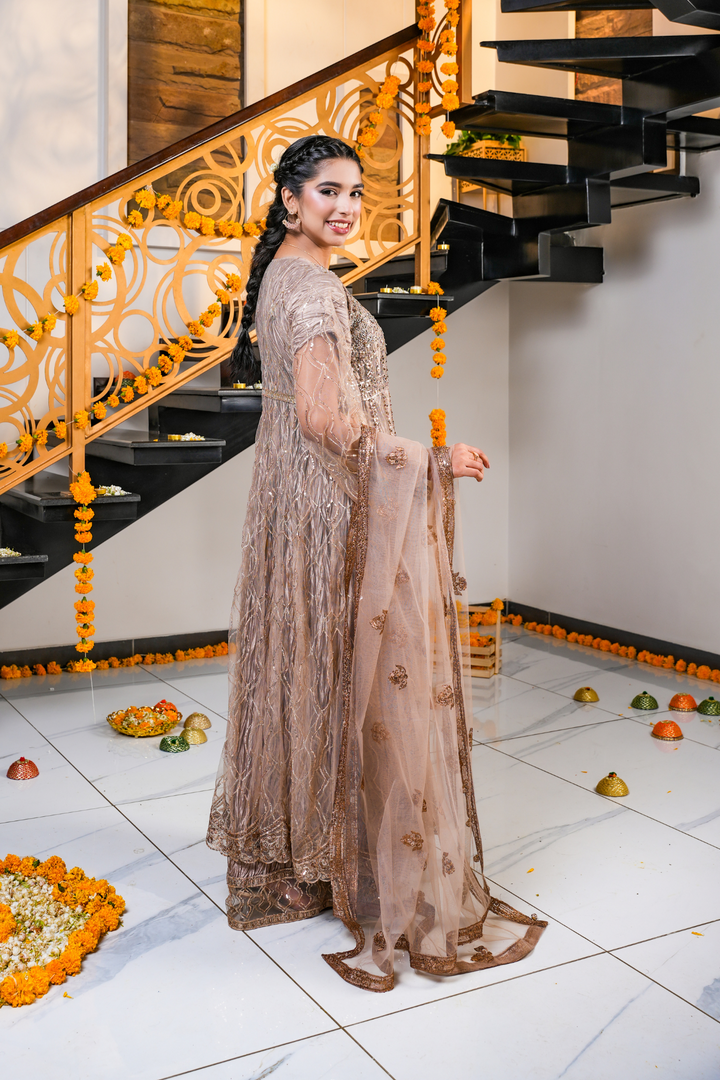 This champagne brown dress features detailed gold and copper embroidery on the dress, pouch, and net dupatta. Designed with a bottom split style, it’s perfect for festive events, weddings, and evening celebrations.