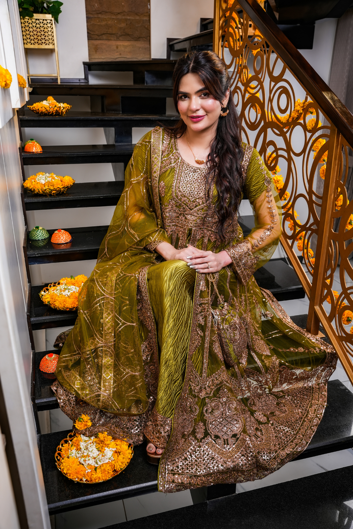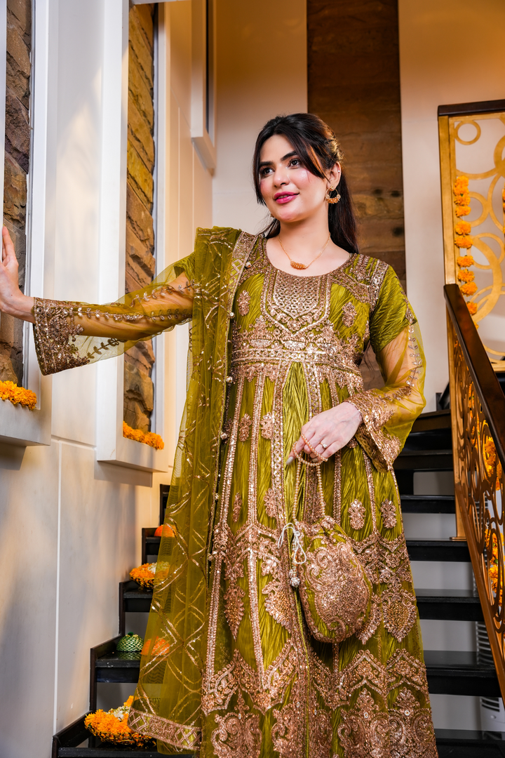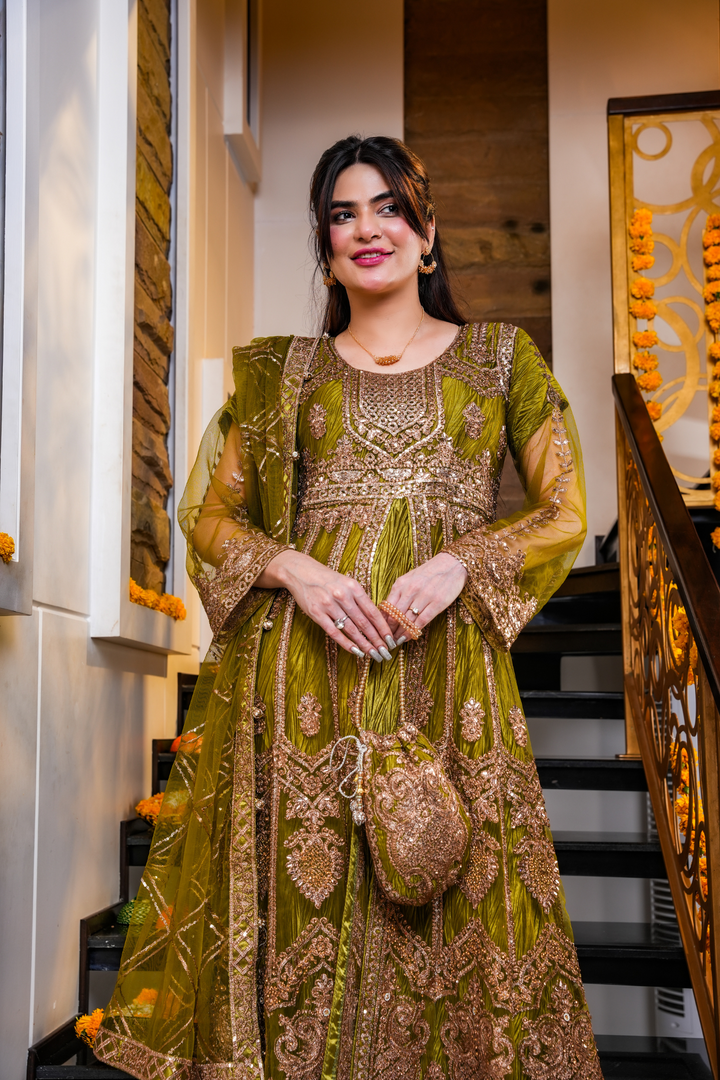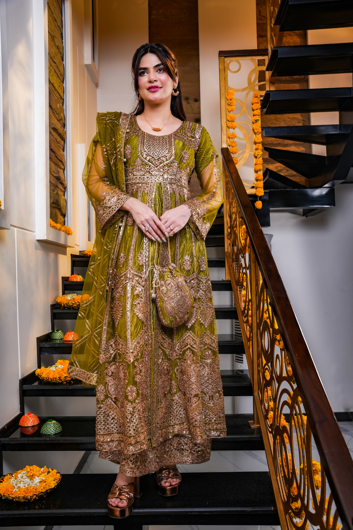A rich moss green dress featuring intricate golden rust embroidery on the front and sleeves, paired with a delicate net dupatta adorned with matching embroidery and a stylish pouch. Designed with a chic split-cut bottom, this ensemble brings together elegance and modern charm for your festive evenings.