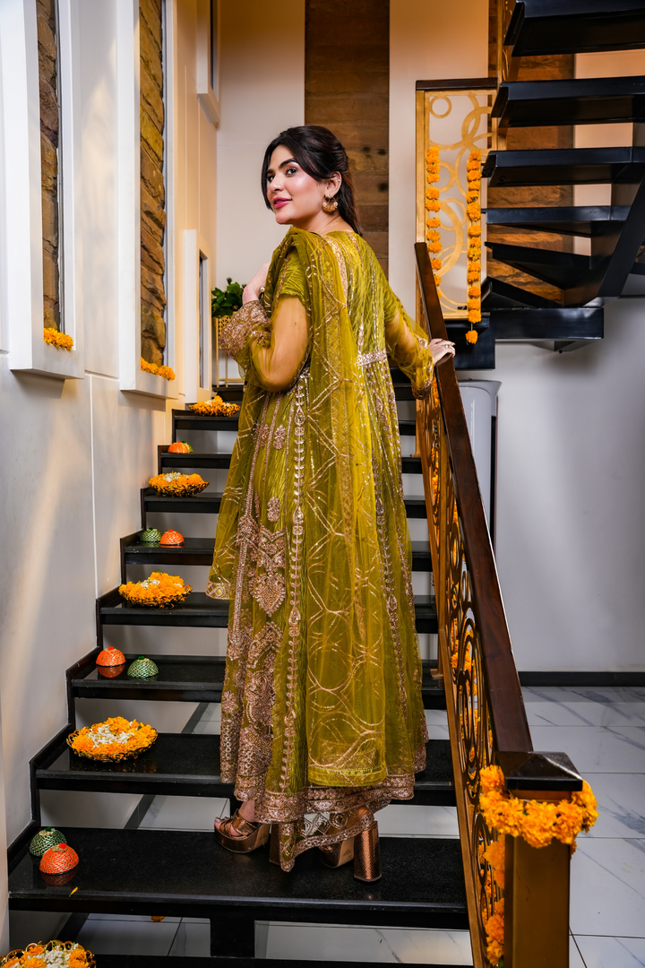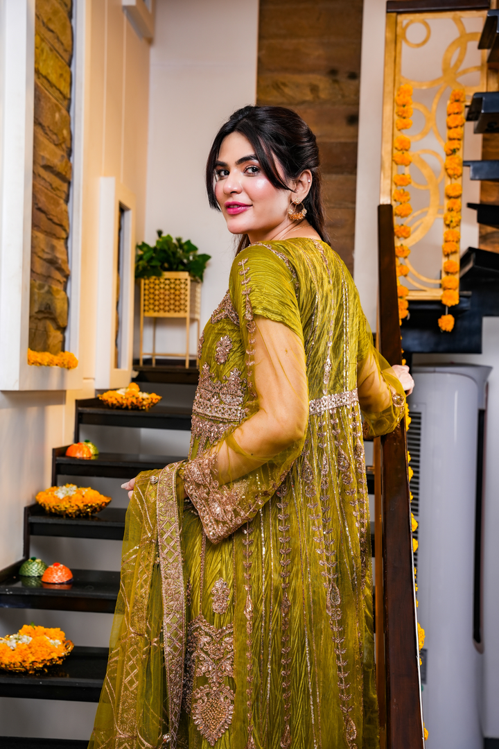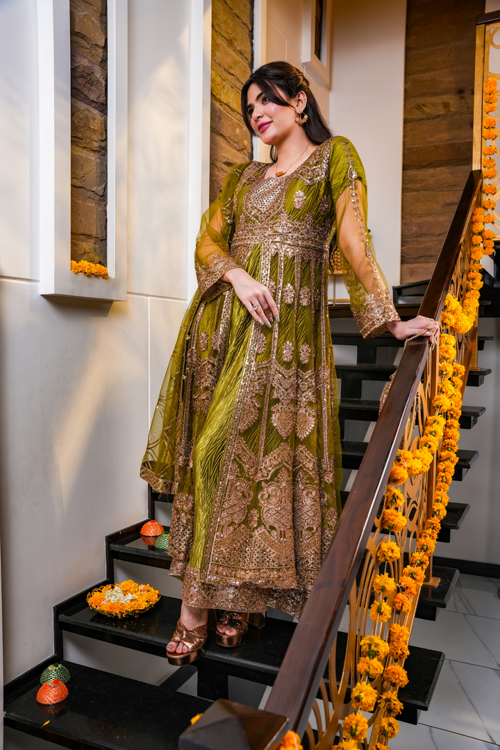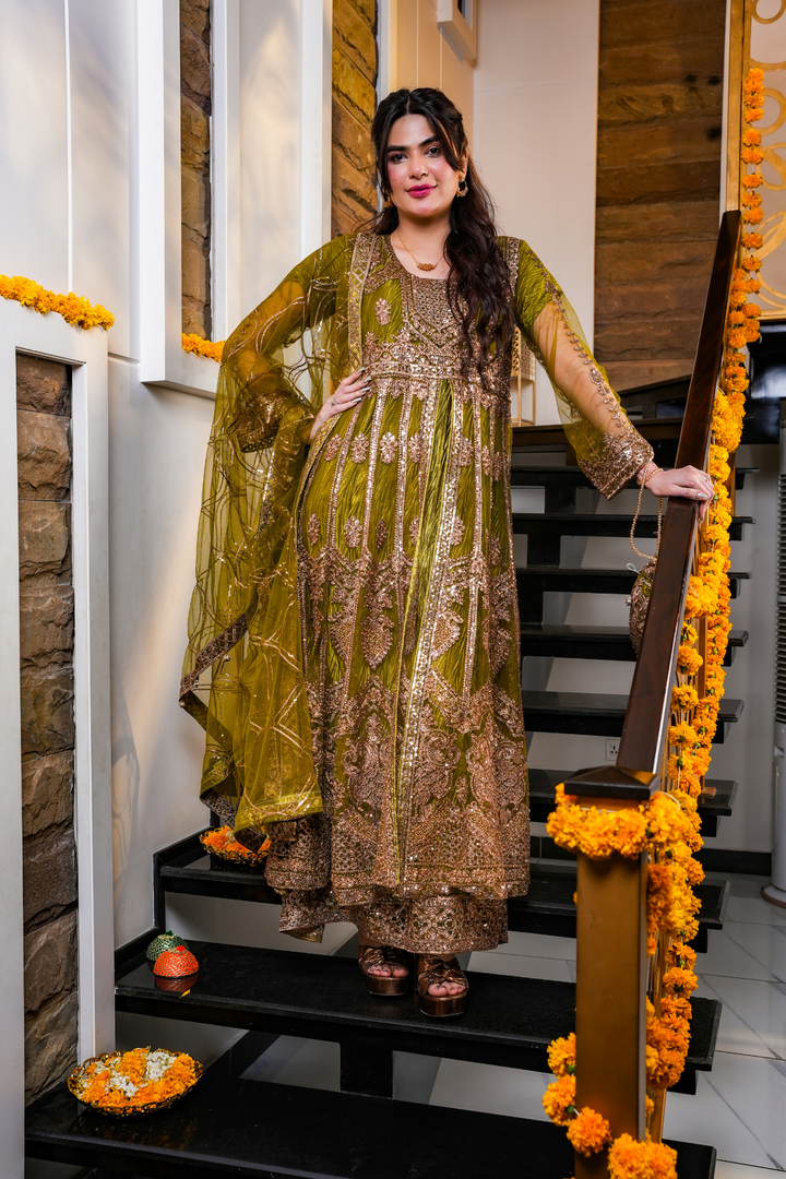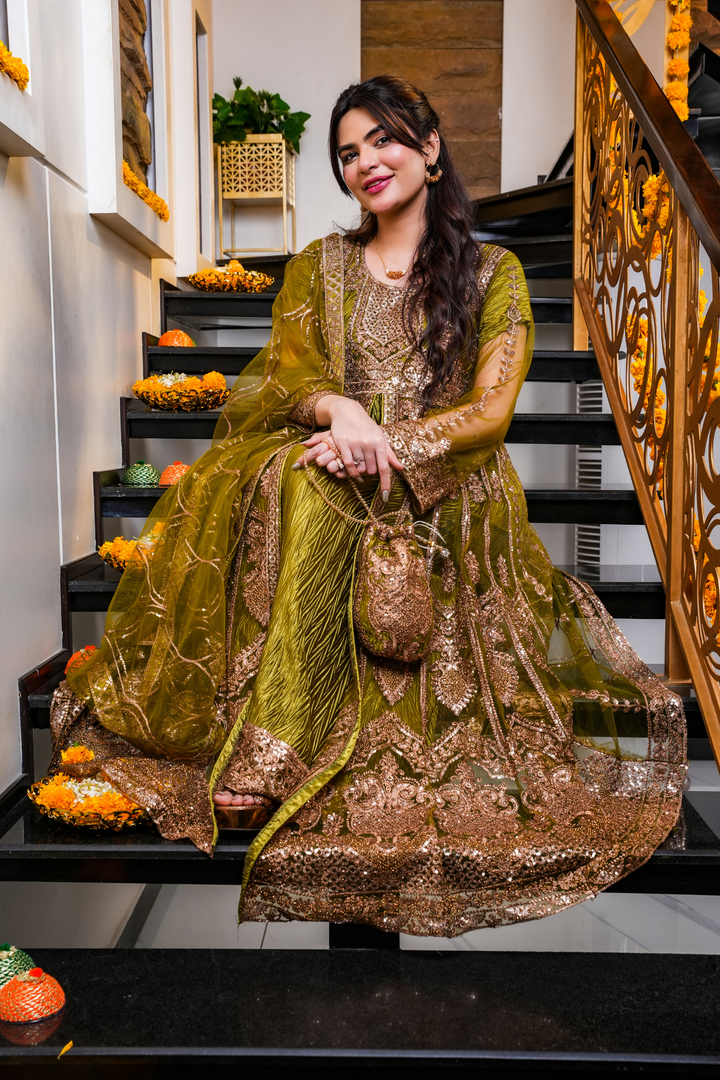 A rich moss green dress featuring intricate golden rust embroidery on the front and sleeves, paired with a delicate net dupatta adorned with matching embroidery and a stylish pouch. Designed with a chic split-cut bottom, this ensemble brings together elegance and modern charm for your festive evenings.