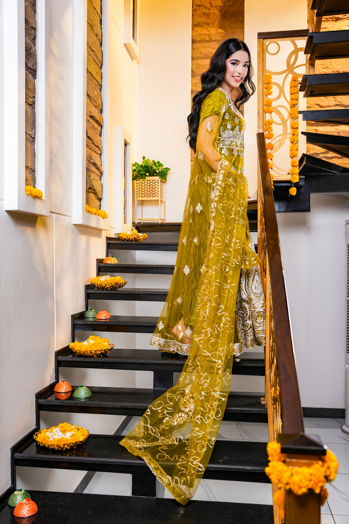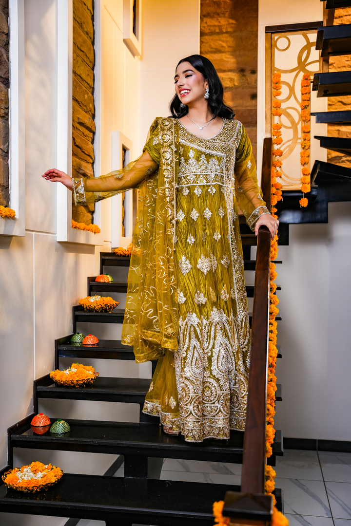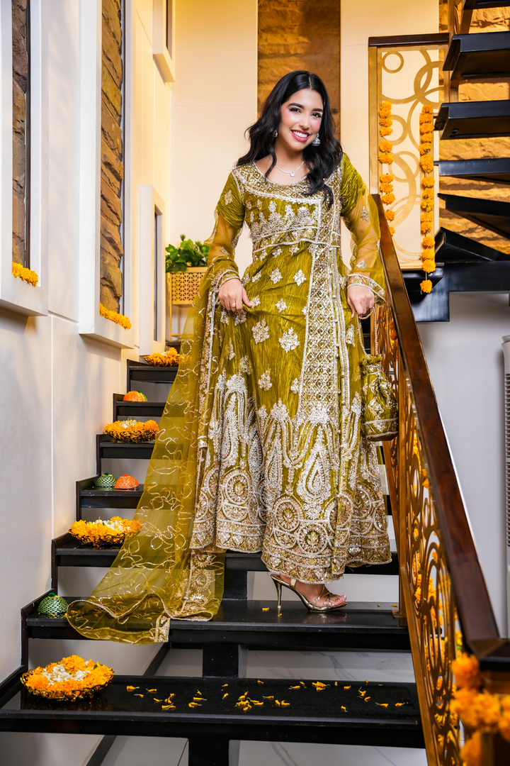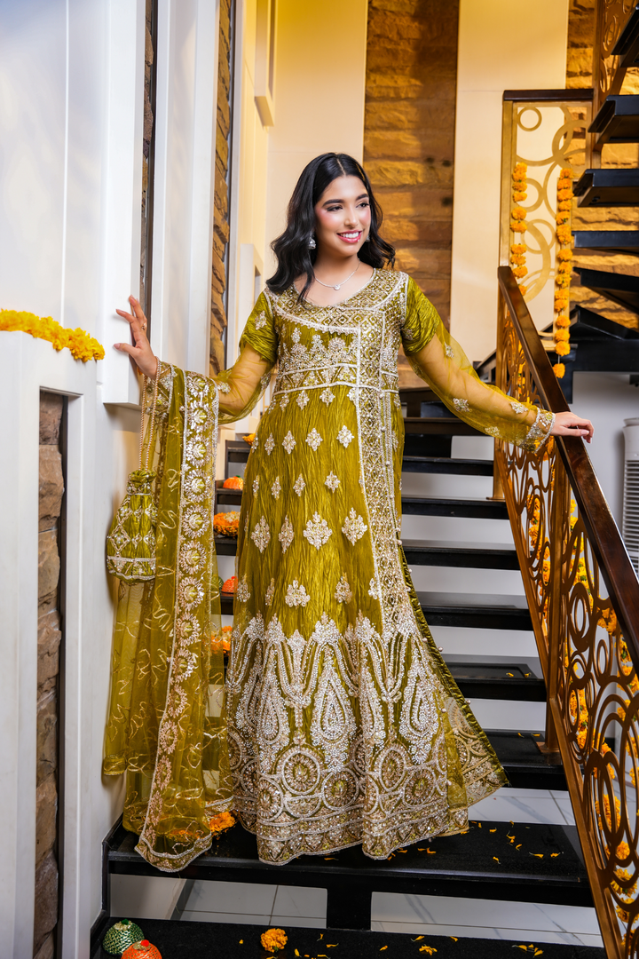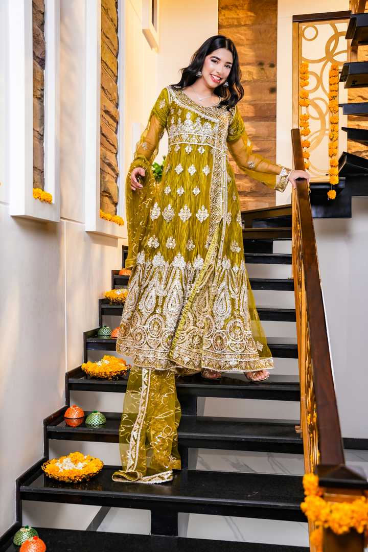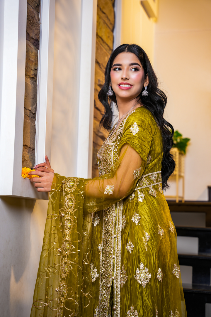 An elegant olive green dress adorned with fine silver embroidery on the front and sleeves, paired with a soft net dupatta featuring detailed embroidery and a matching pouch. Designed with a modern side-cut silhouette, this ensemble blends traditional craftsmanship with contemporary grace.