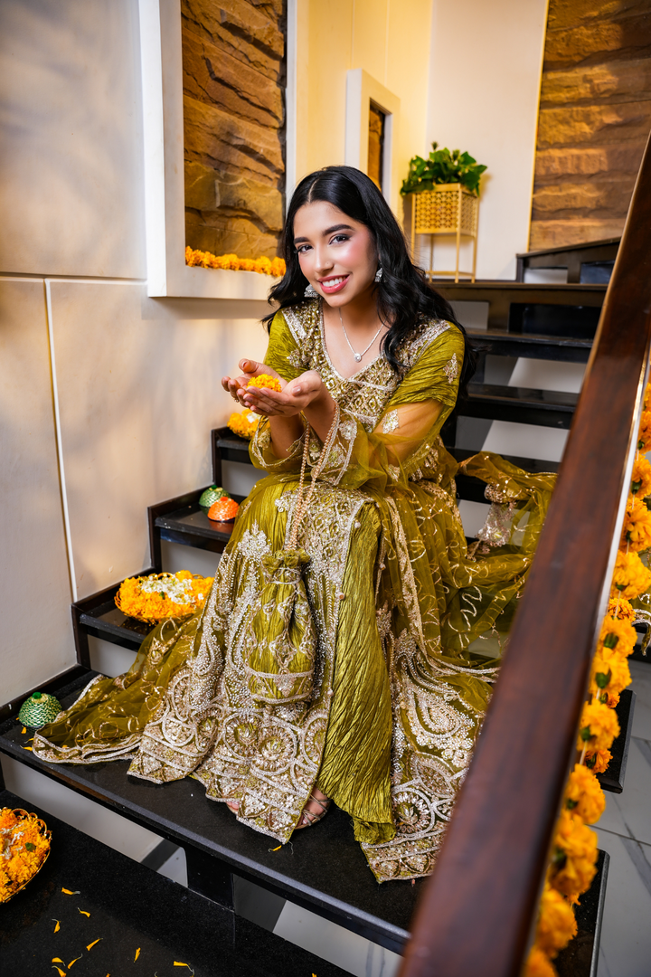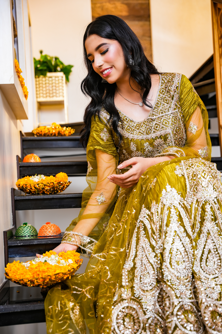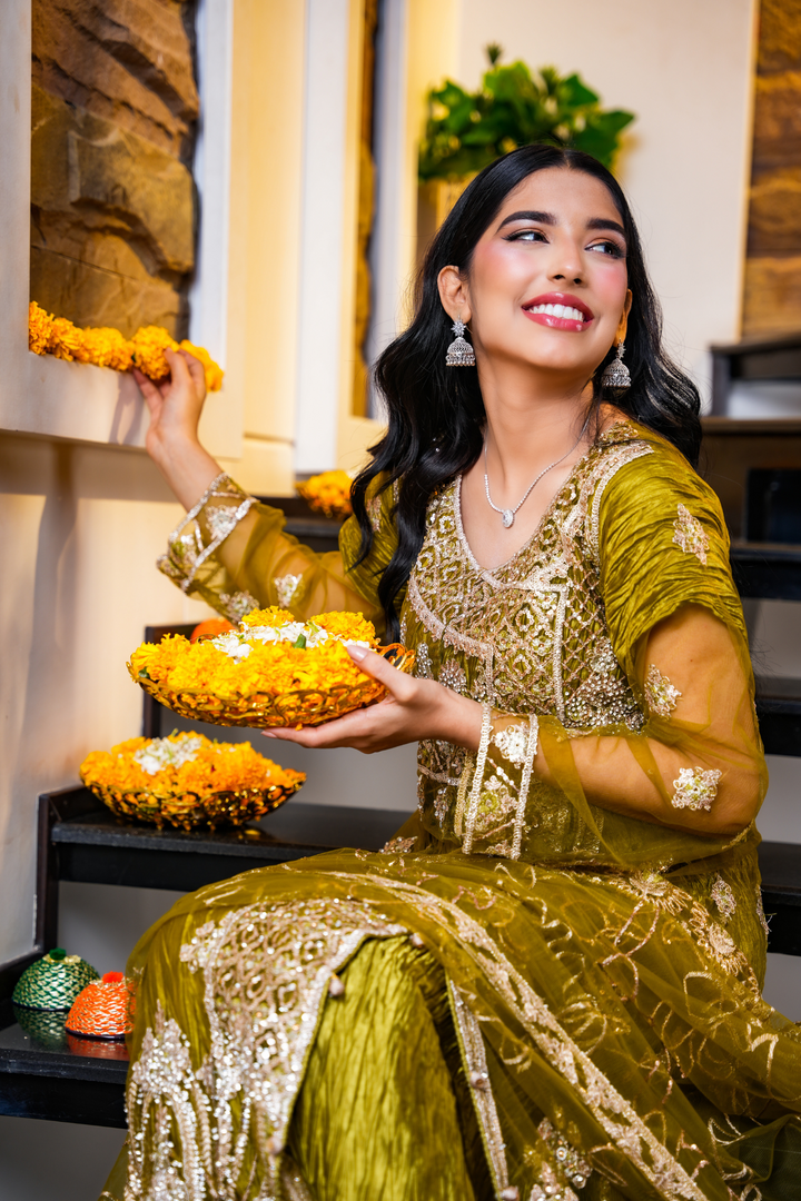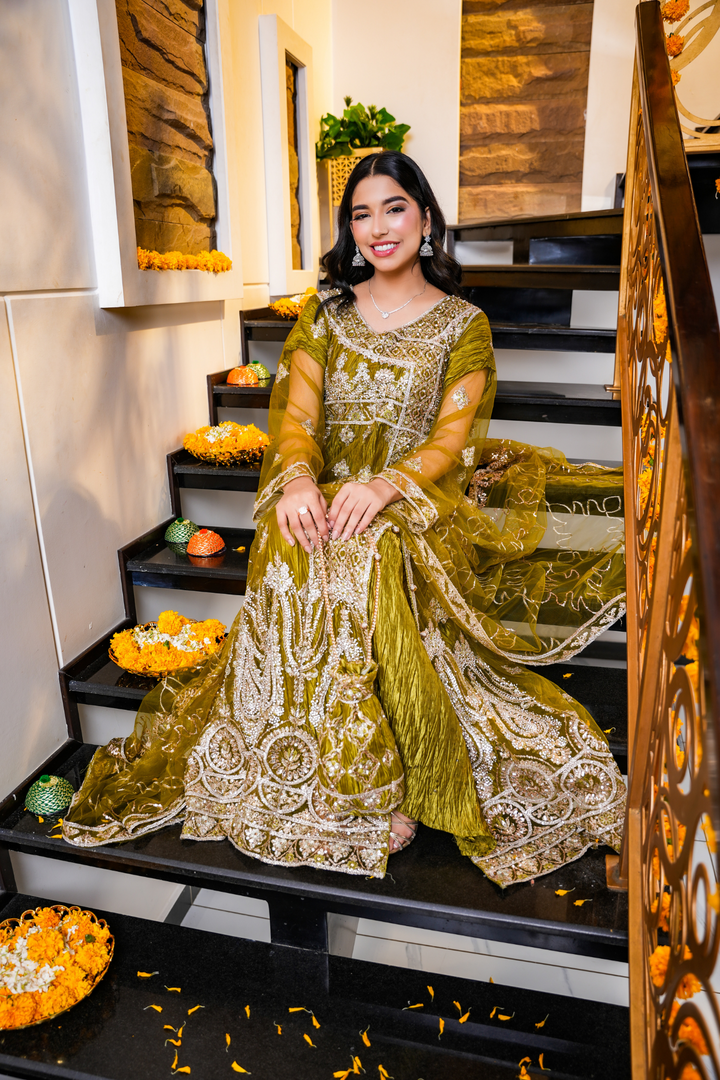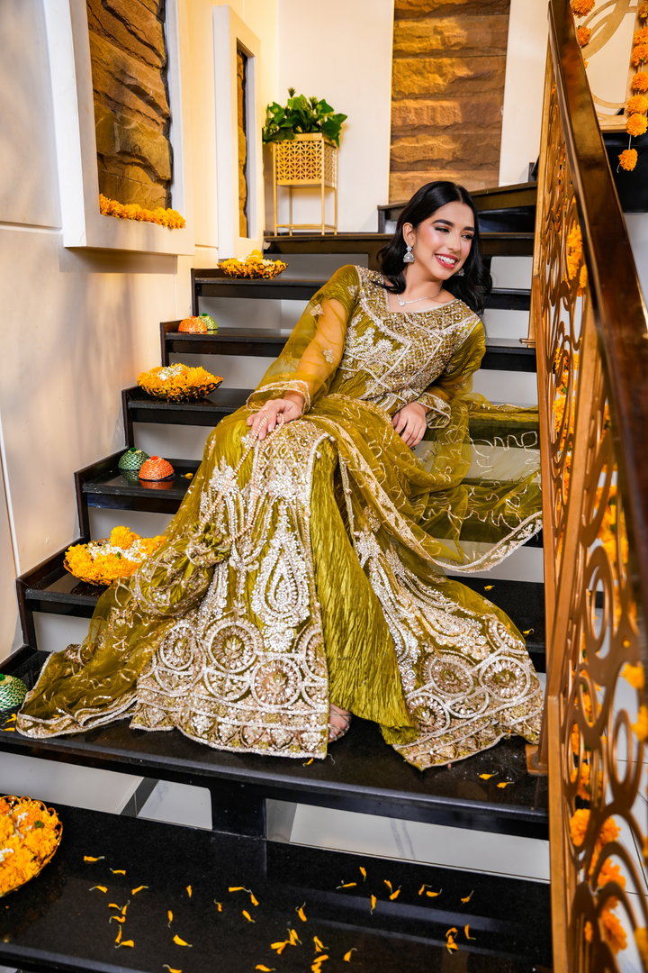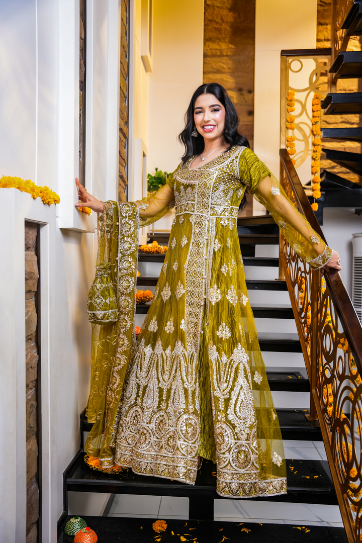 An elegant olive green dress adorned with fine silver embroidery on the front and sleeves, paired with a soft net dupatta featuring detailed embroidery and a matching pouch. Designed with a modern side-cut silhouette, this ensemble blends traditional craftsmanship with contemporary grace.