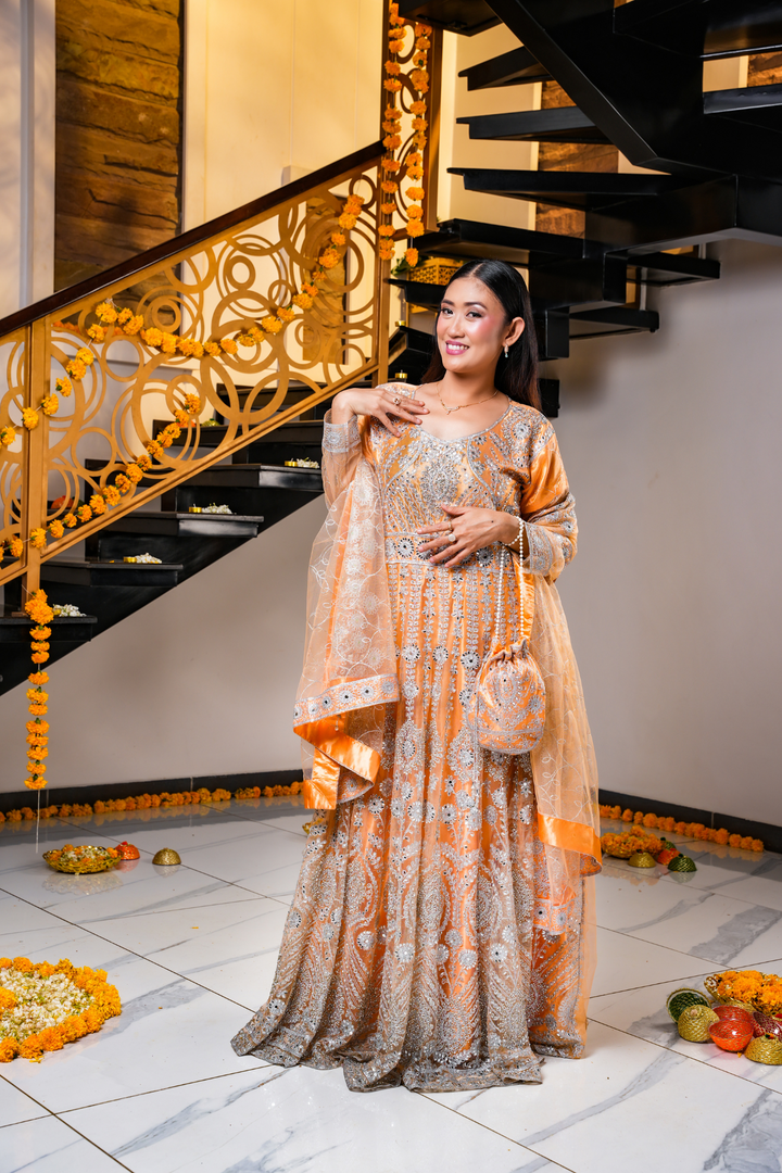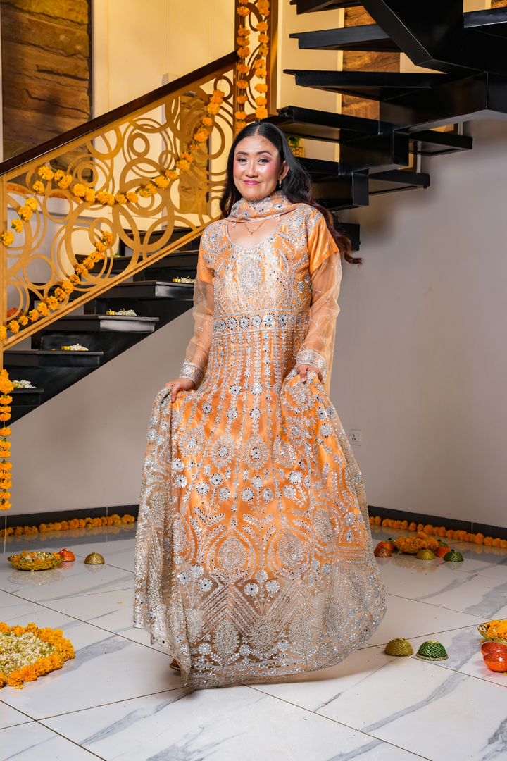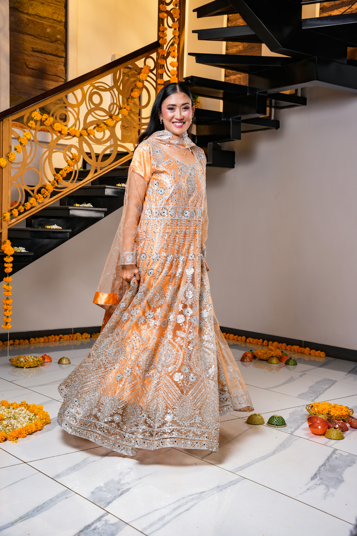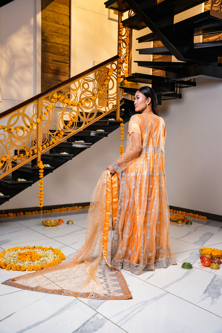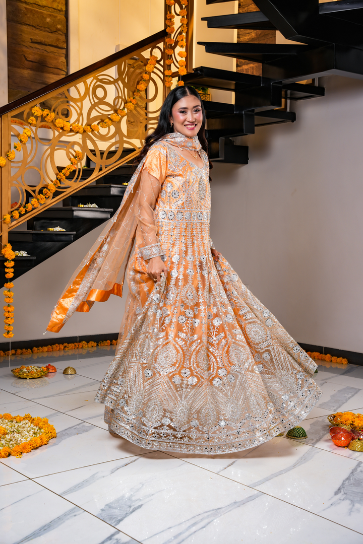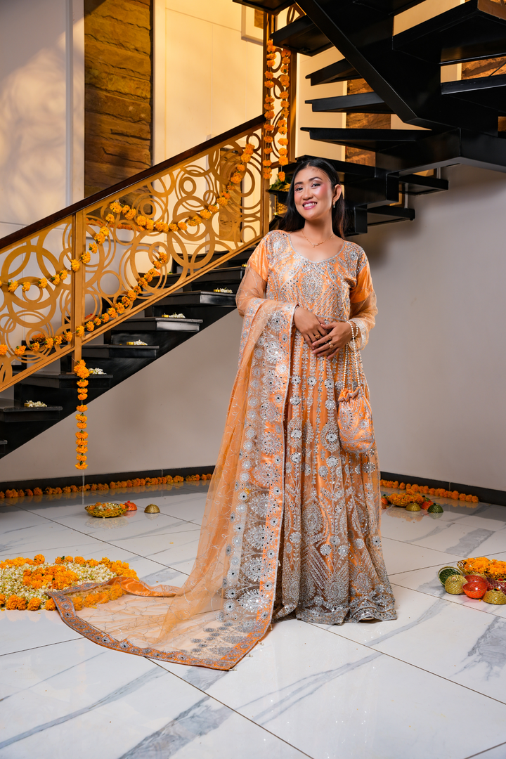 A soft light peach outfit adorned with silver embroidery on the front and sleeves, paired with a delicately embroidered net dupatta and a matching pouch. Designed with a refined silhouette, this piece adds a graceful, festive vibe to your wardrobe.