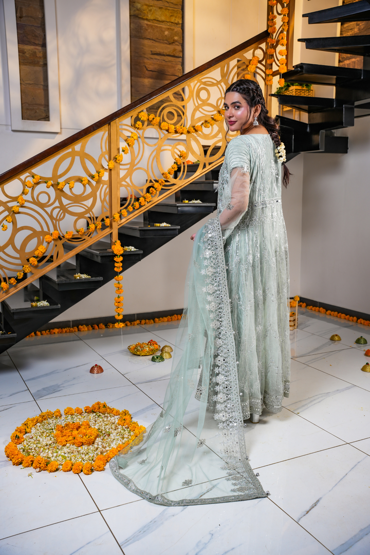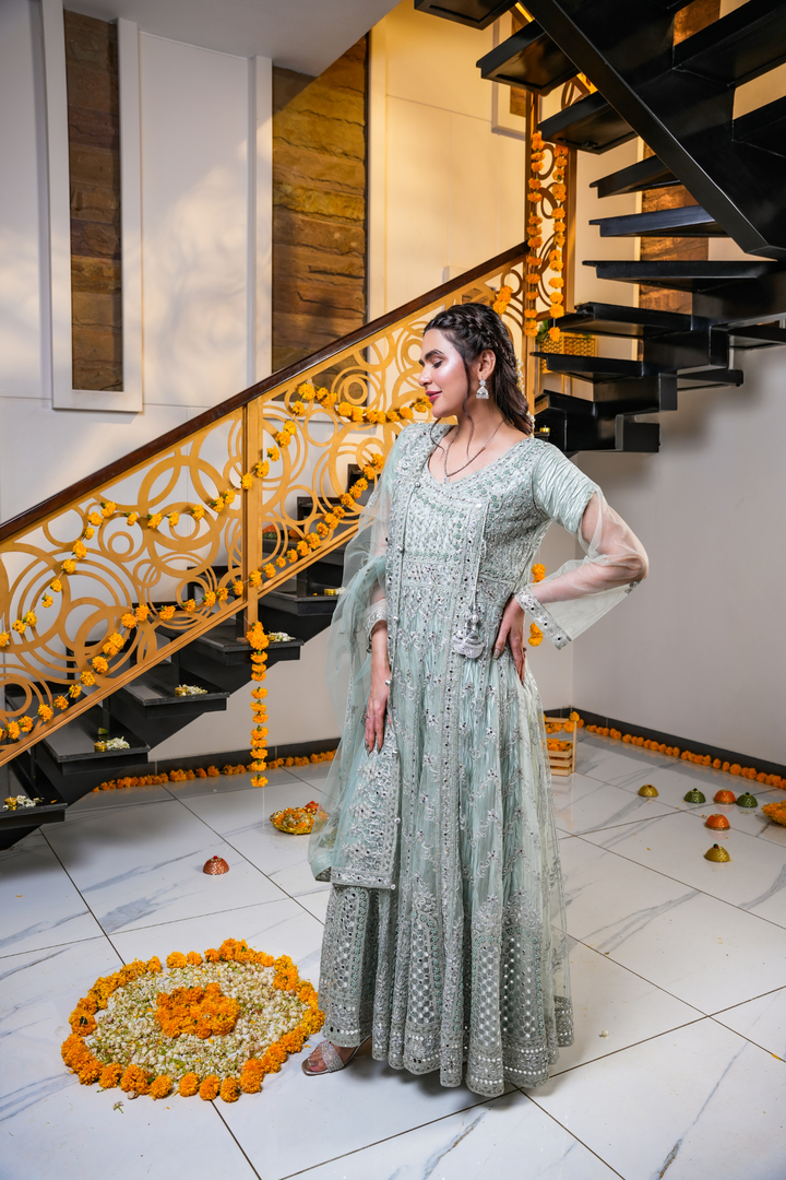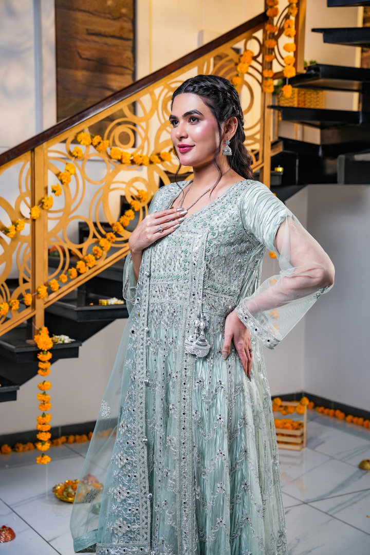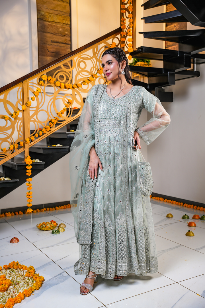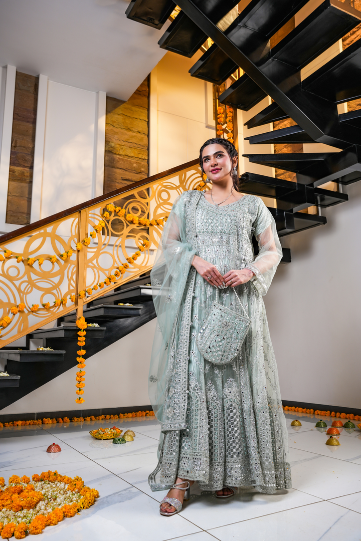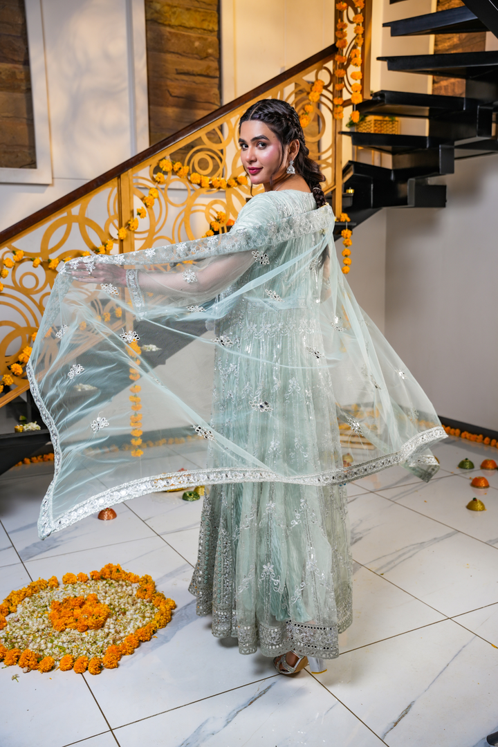 An aqua light dress from our Diva Collection with fine silver embroidery on the dress, pouch, and net dupatta. Features a side split cut for a refined, modern look.