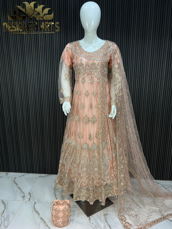 An elegant Peach Pink dress adorned with fine silver embroidery on the front and sleeves, paired with a soft net dupatta featuring detailed embroidery and a matching pouch. Designed with a modern side-cut silhouette, this ensemble blends traditional craftsmanship with contemporary grace.