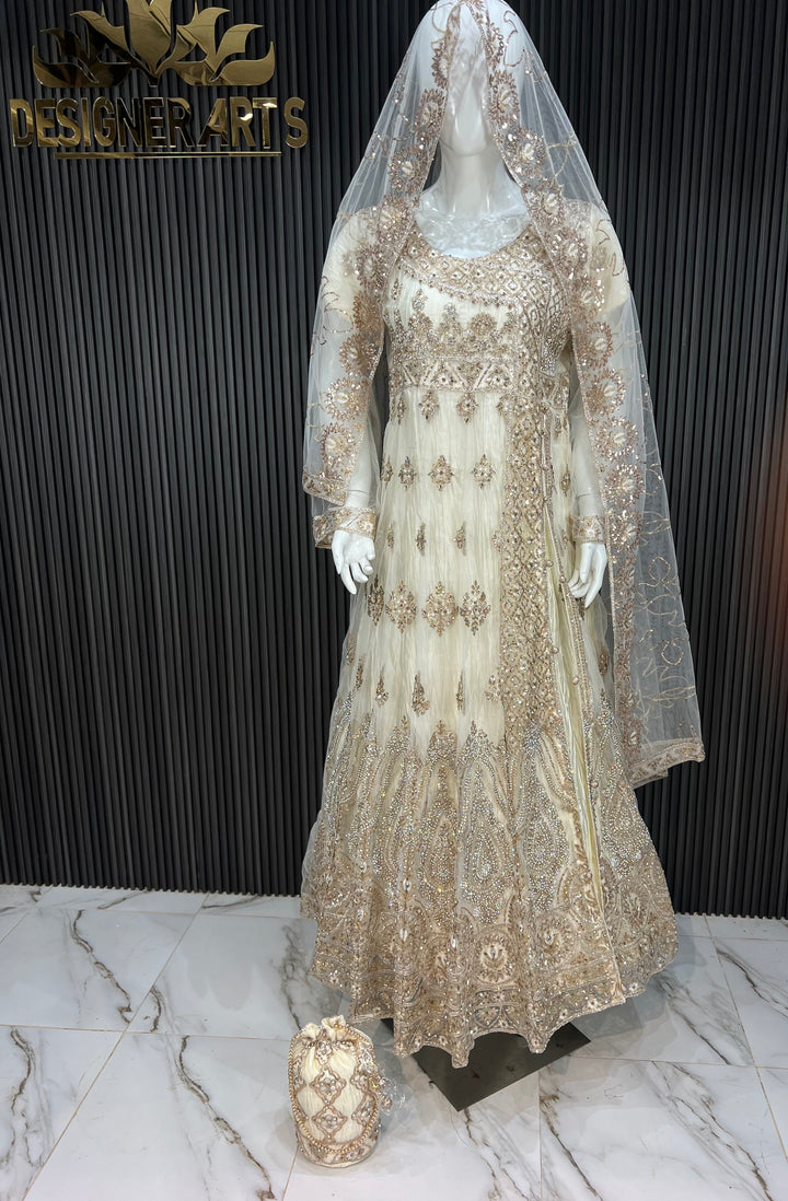 An elegant Off white dress adorned with fine silver embroidery on the front and sleeves, paired with a soft net dupatta featuring detailed embroidery and a matching pouch. Designed with a modern side-cut silhouette, this ensemble blends traditional craftsmanship with contemporary grace.