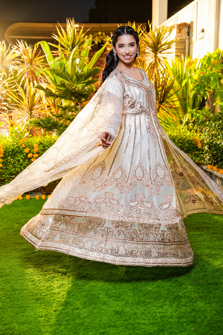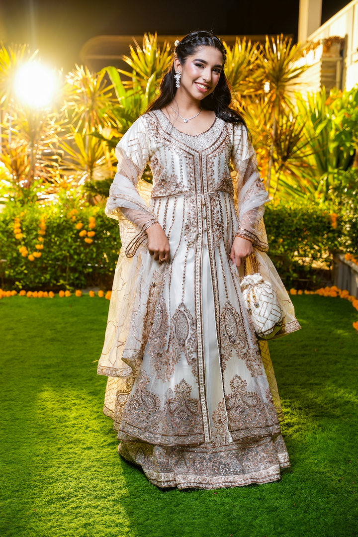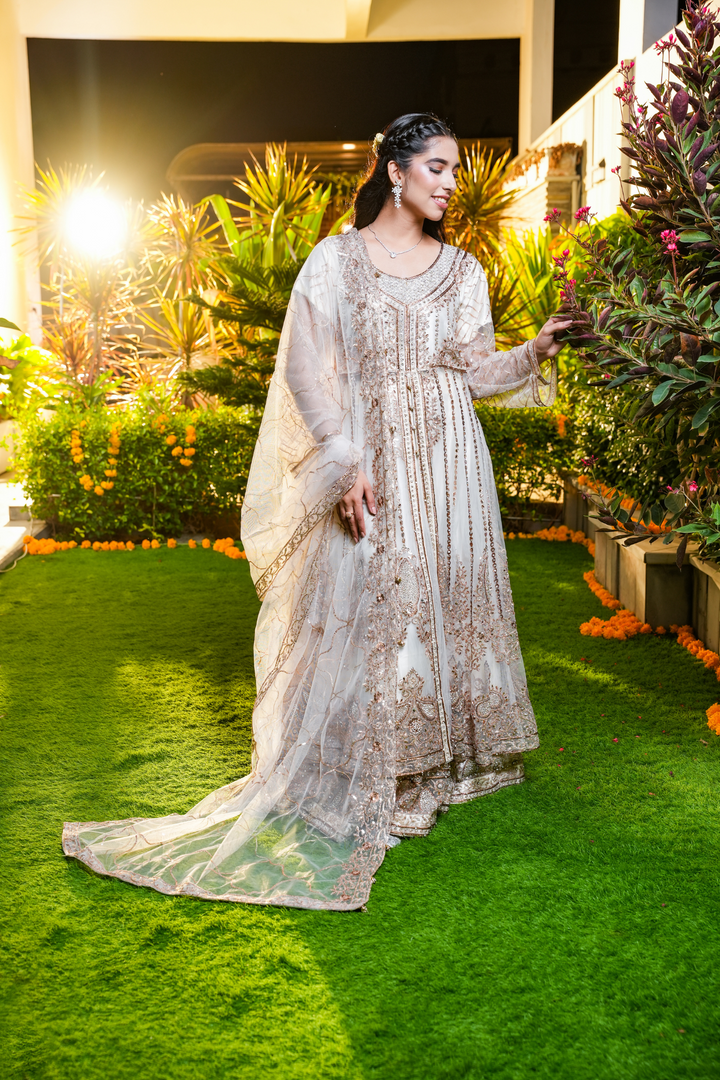 A pristine white outfit with golden and light copper embroidery on the front and sleeves, styled with a short coat design and bottom open cut. Paired with an embroidered net dupatta and a matching pouch.