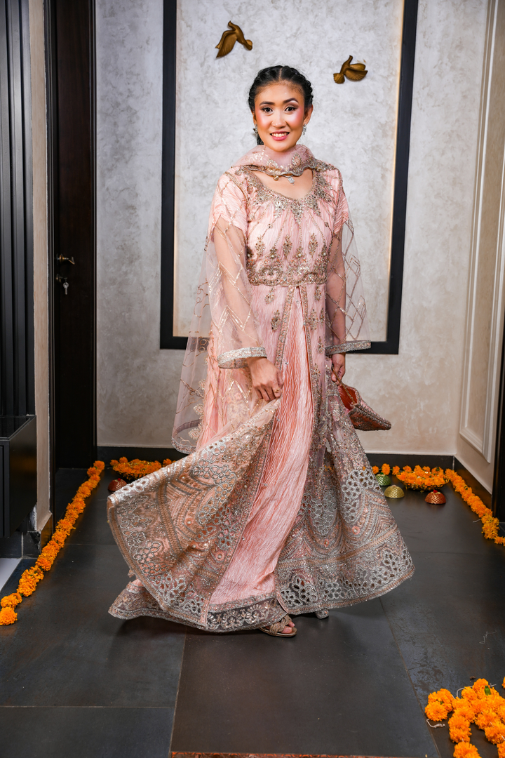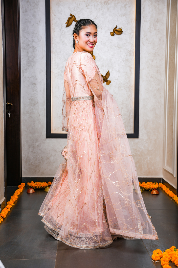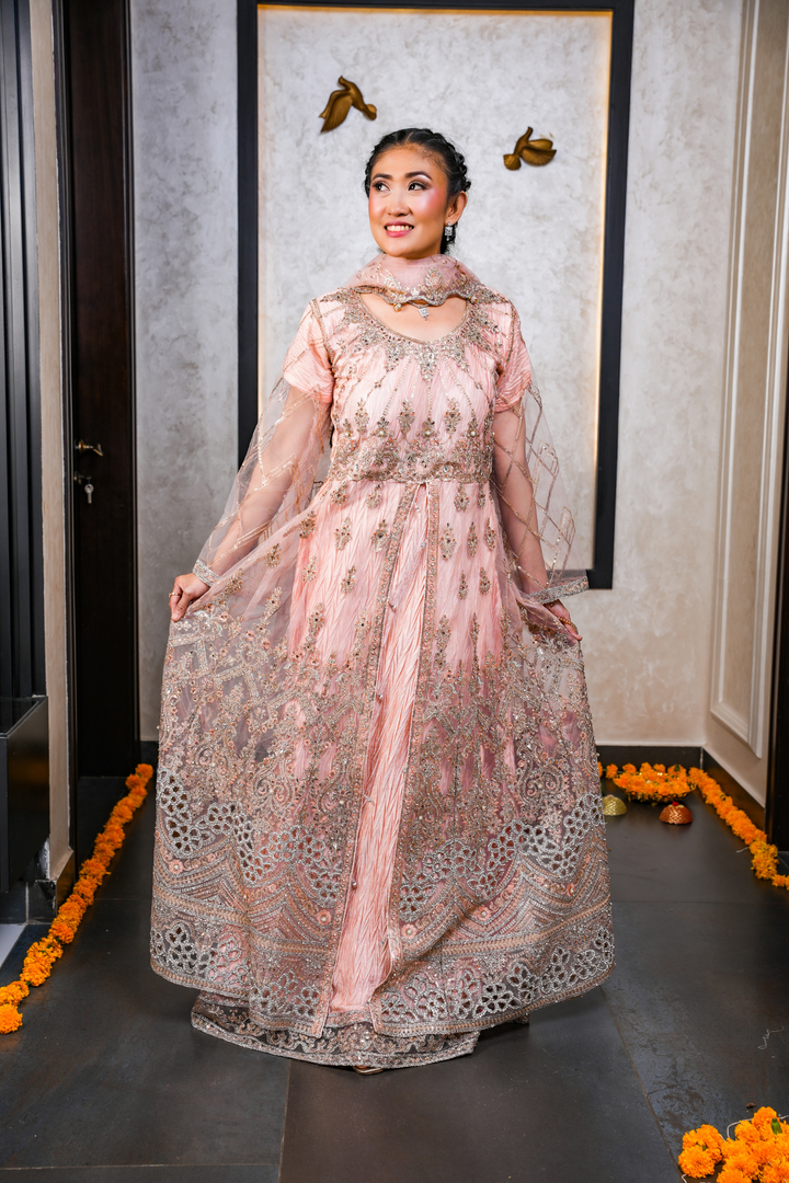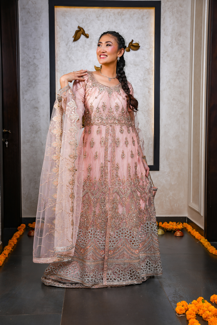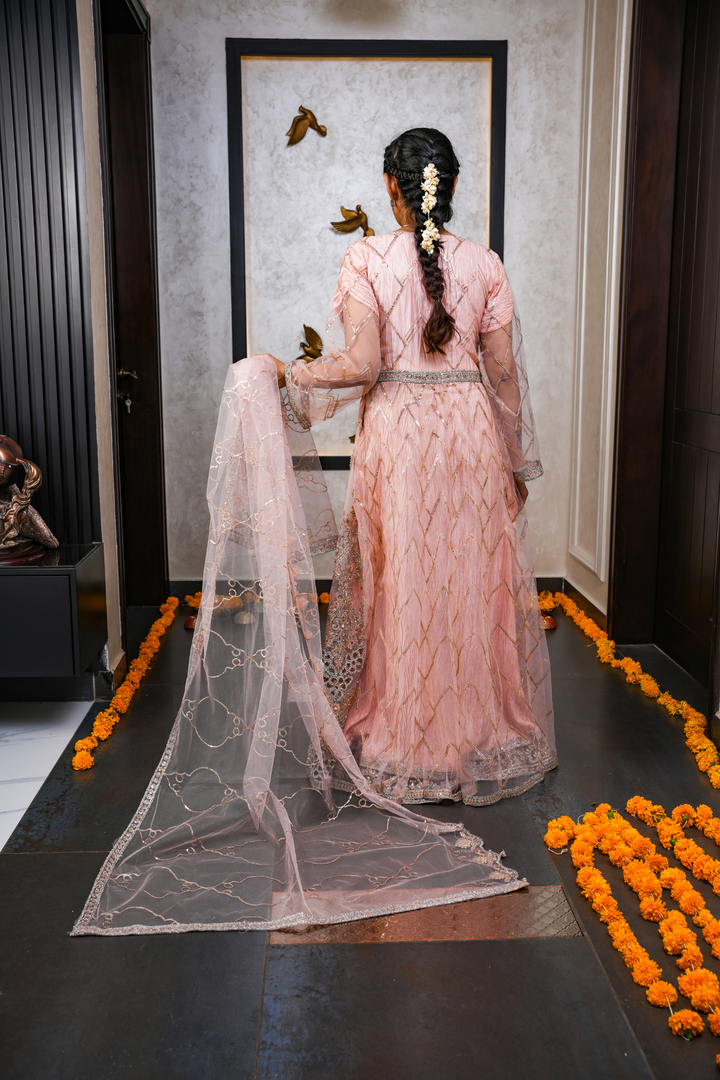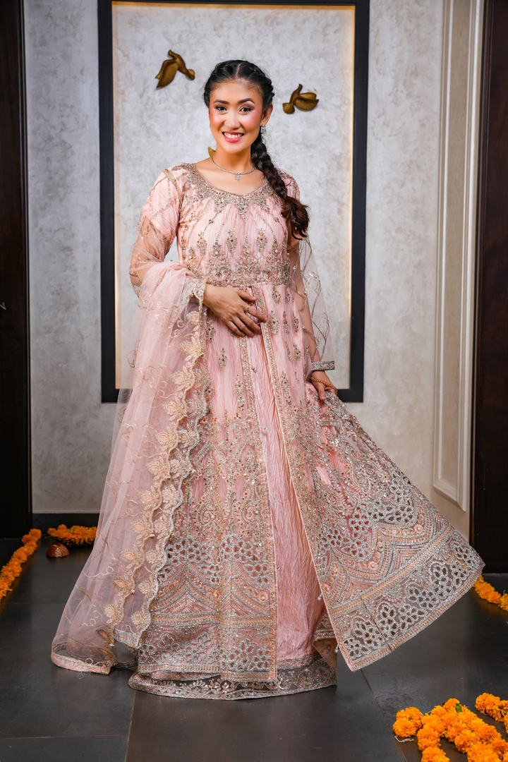 Meet Peach Whisper from the Diva Collection by Designer Art. This peach pink outfit features detailed embroidery on the dress, a soft net dupatta, and a matching pouch. Subtle tassels line the split cut bottom, adding an easy flow and charm