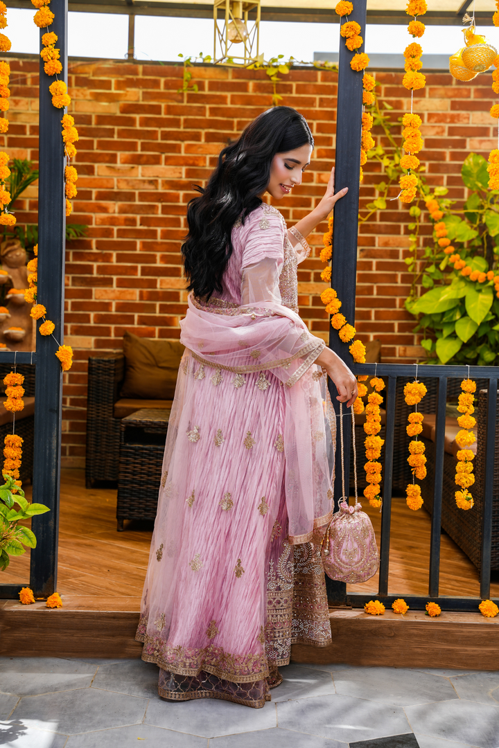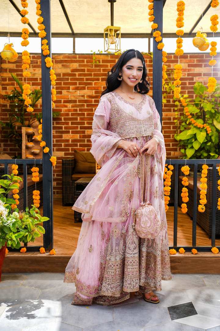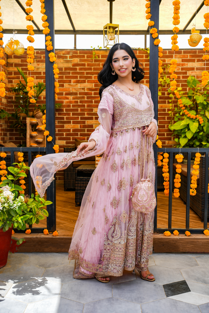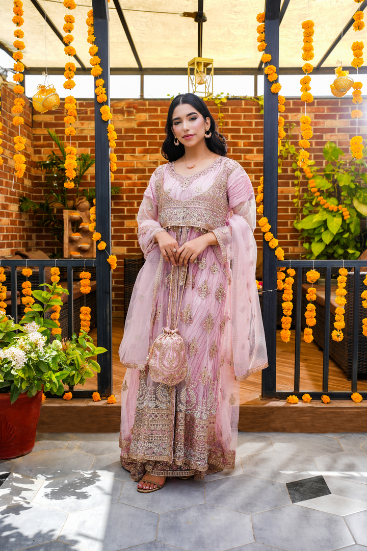 A stunning blush pink short coat style outfit from the Diva Collection. Featuring delicate embroidery on the coat, split bottom design, and matching embroidery on the net dupatta and pouch. Tassel details hanging beneath the coat add a playful yet elegant touch. Perfect for festive evenings and graceful celebrations.