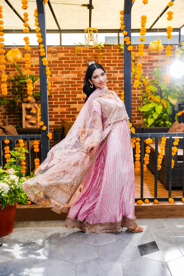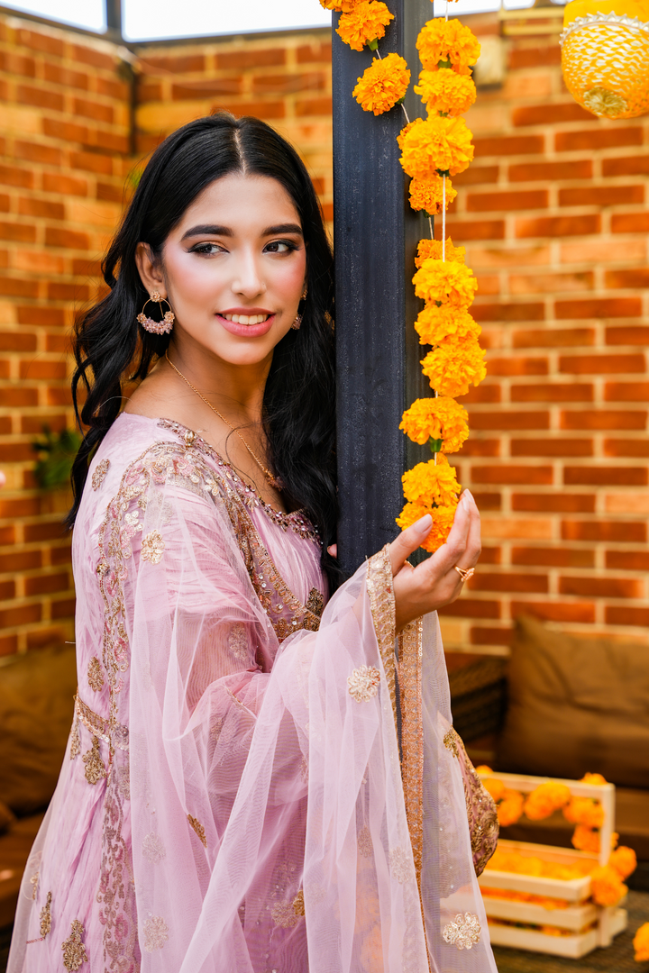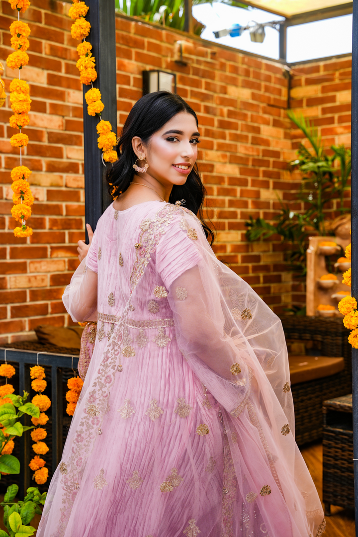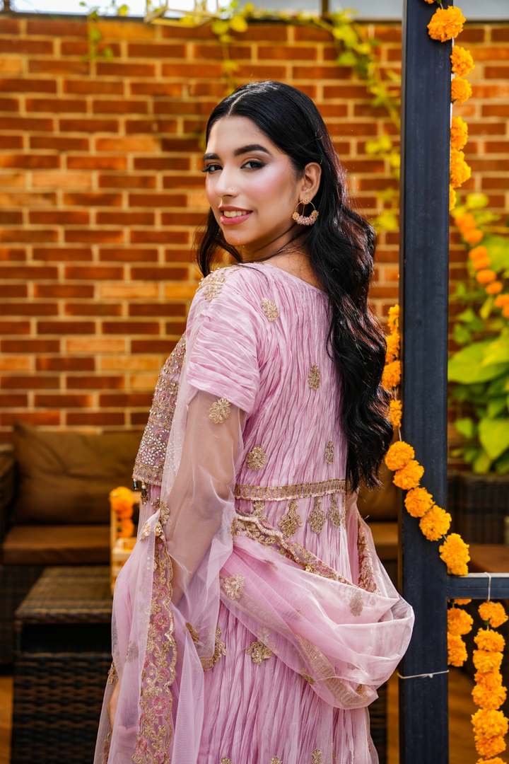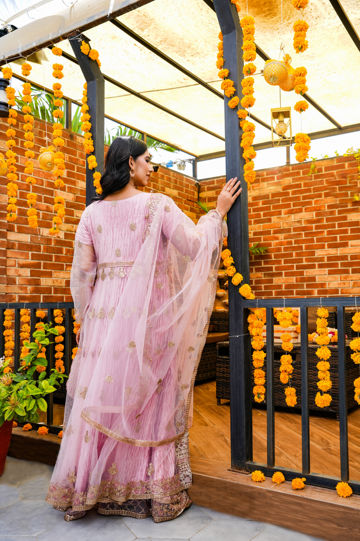 A stunning blush pink short coat style outfit from the Diva Collection. Featuring delicate embroidery on the coat, split bottom design, and matching embroidery on the net dupatta and pouch. Tassel details hanging beneath the coat add a playful yet elegant touch. Perfect for festive evenings and graceful celebrations.