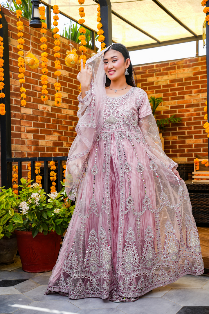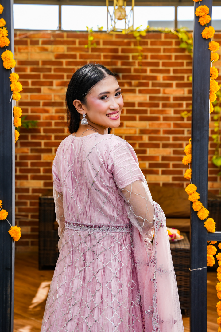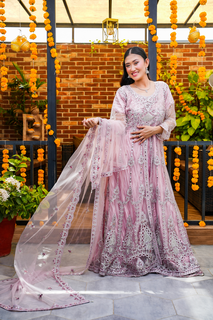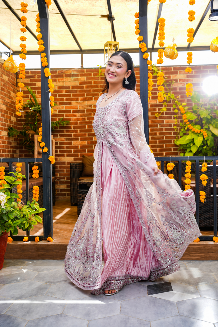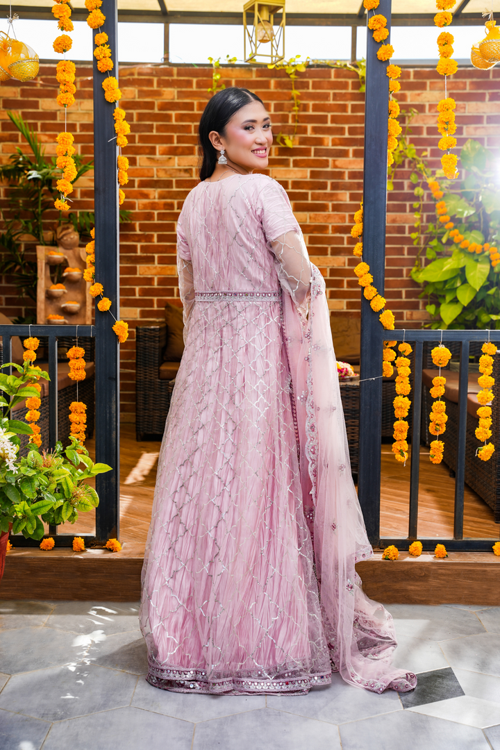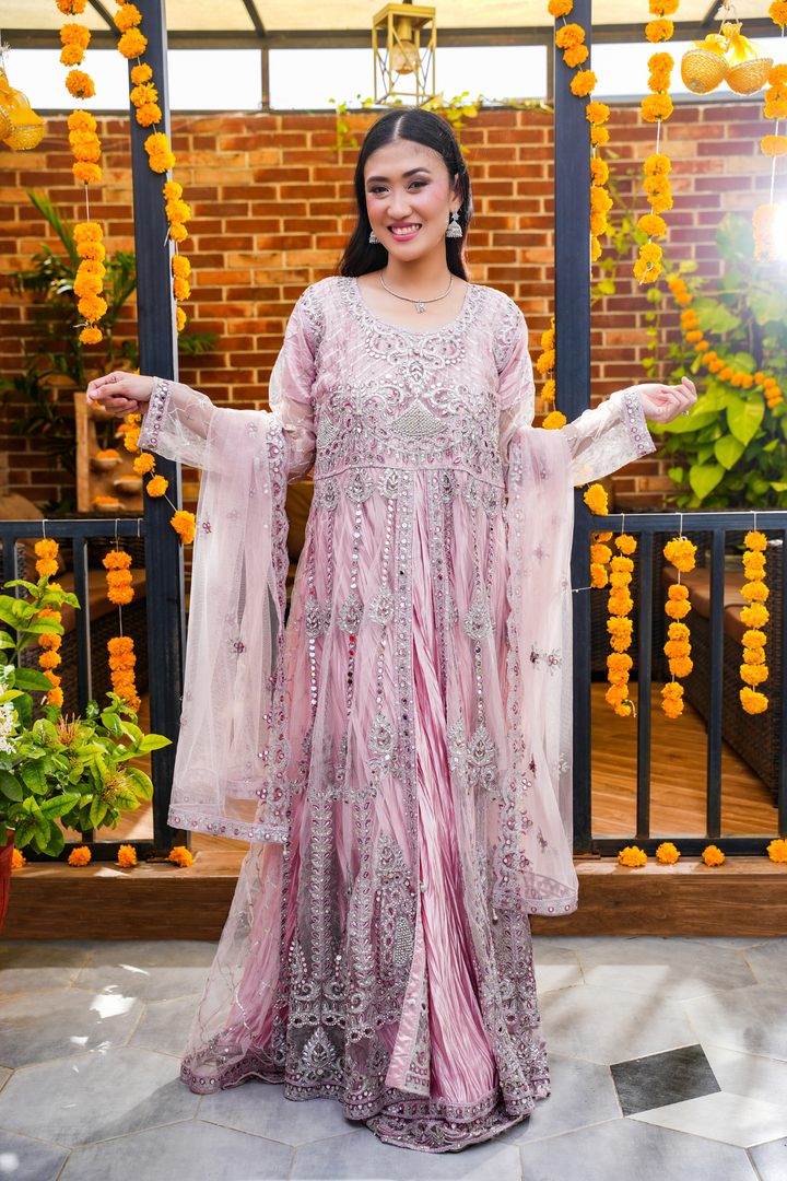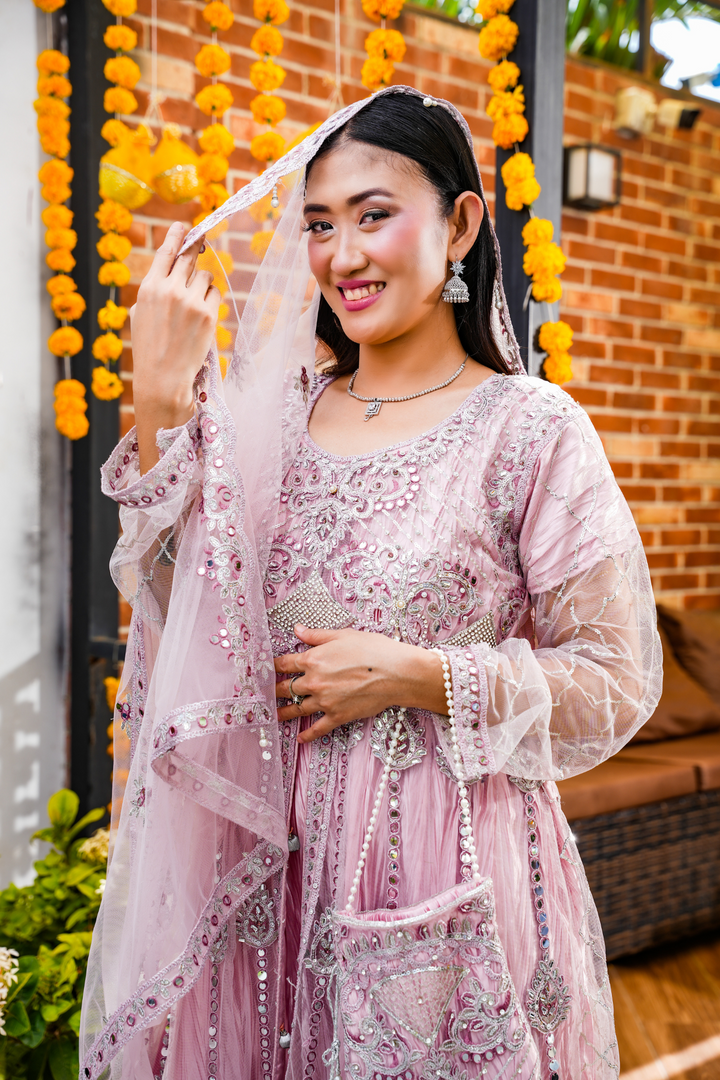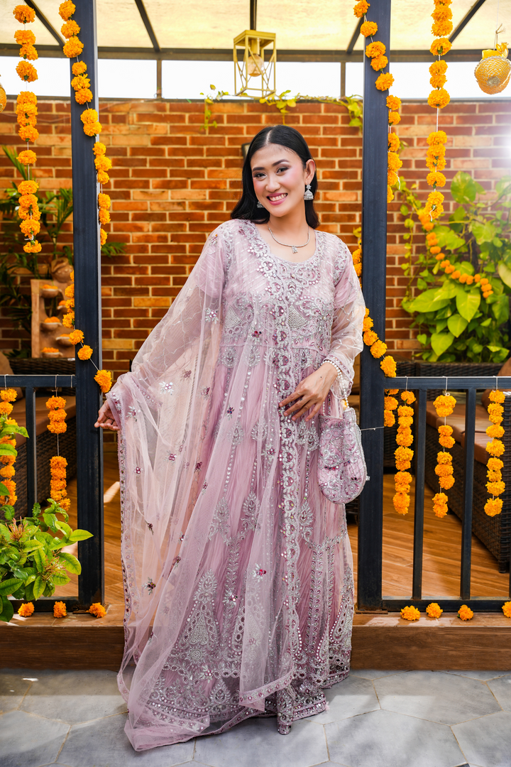 A soft pink outfit with delicate silver embroidery on the front, sleeves, and matching pouch. Paired with a net dupatta featuring fine embroidered details, and a stylish split cut bottom for a modern festive touch. Perfect for celebrations that call for elegance with a hint of shimmer.