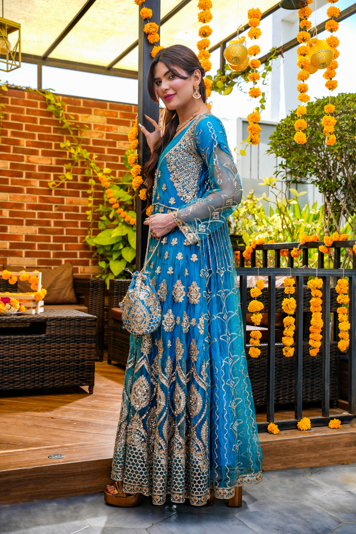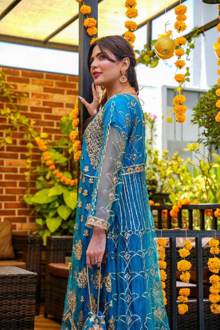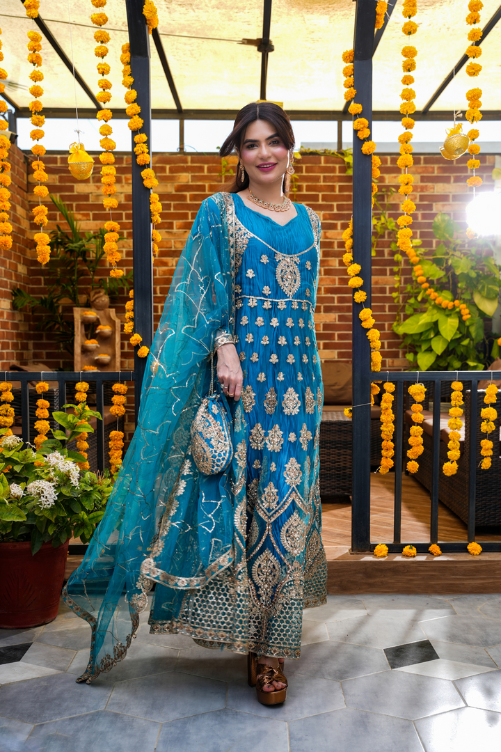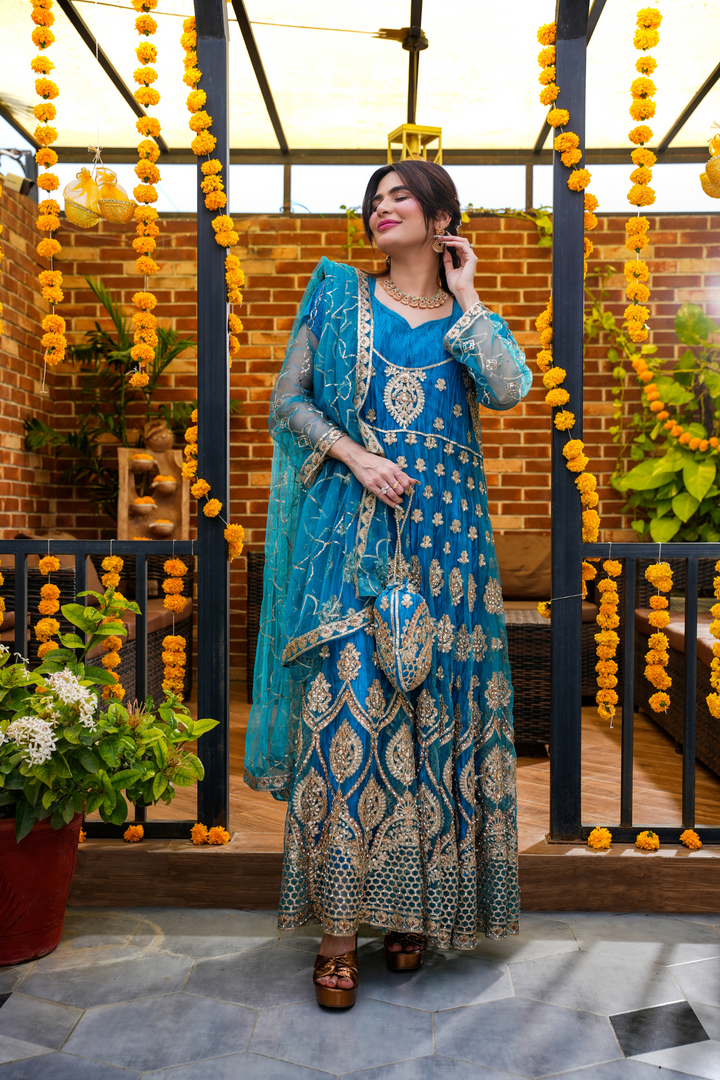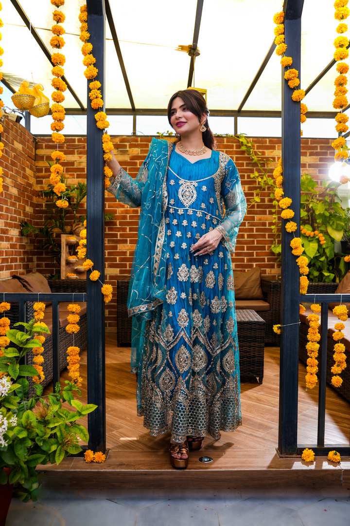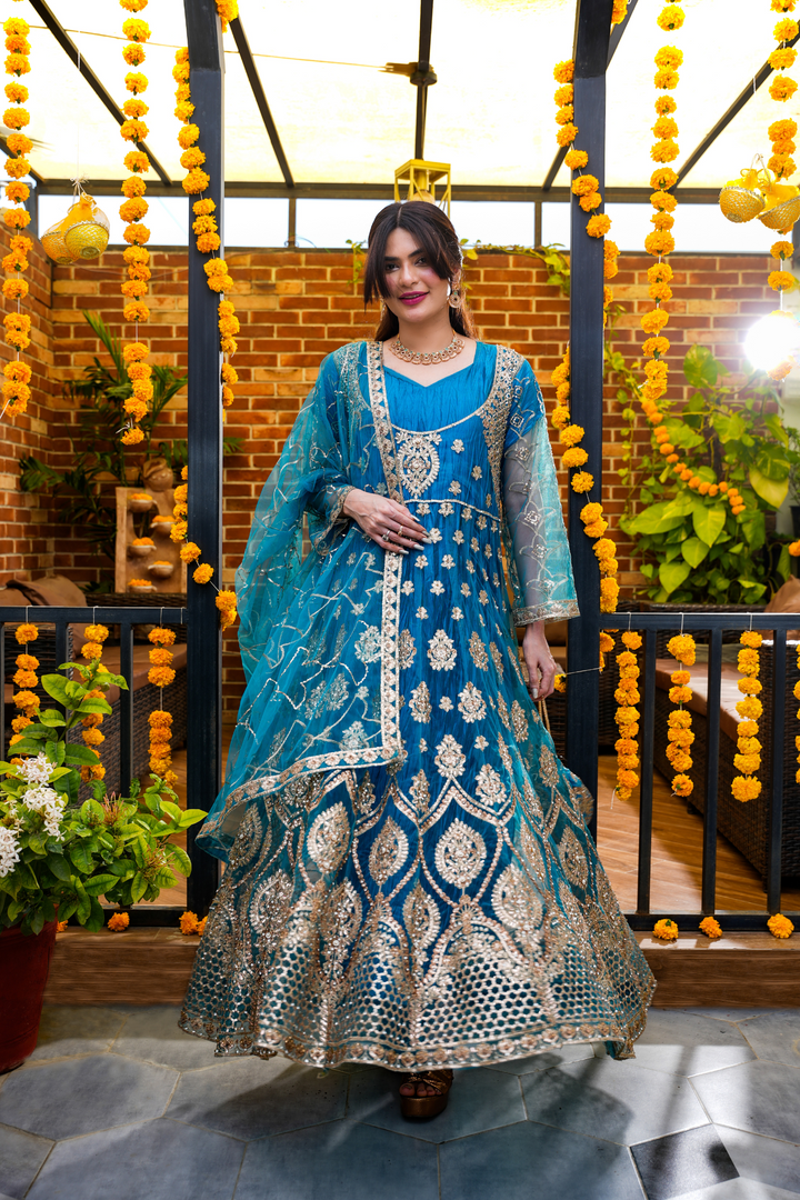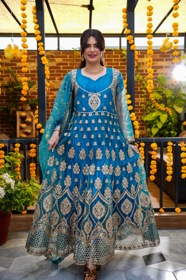 Turn heads this festive season with our Royal Teal Embellished Anarkali, adorned with intricate gold zari and sequin embroidery. Crafted in premium net with a voluminous flare, this outfit blends traditional charm and modern luxury, perfect for weddings, mehndi nights, or festive gatherings. Comes with a matching dupatta and delicate embellishments for a regal look.