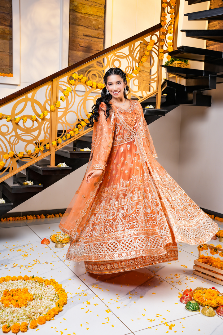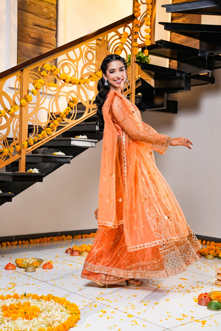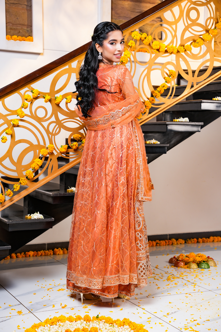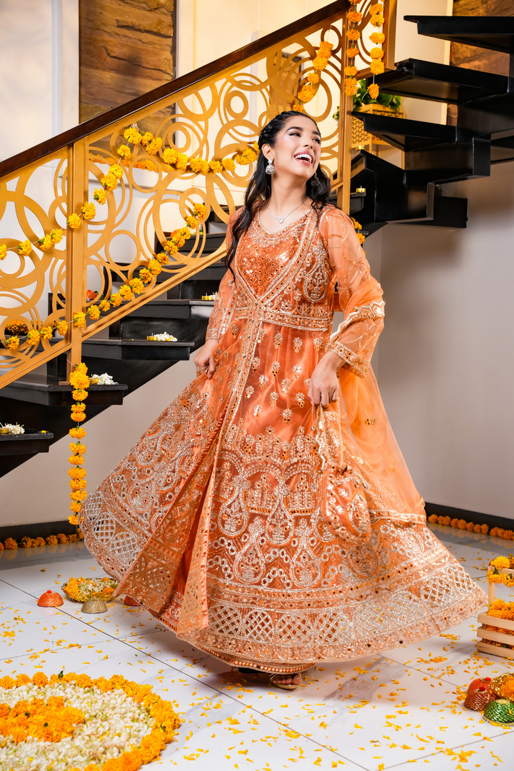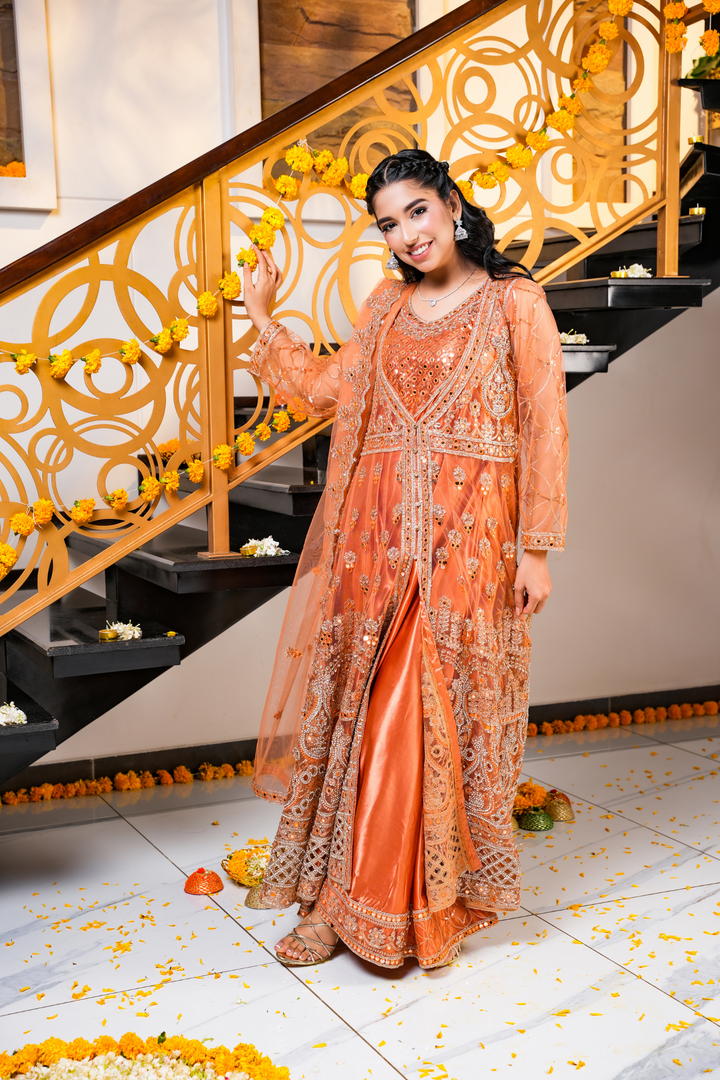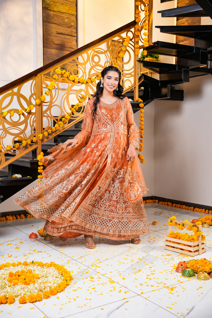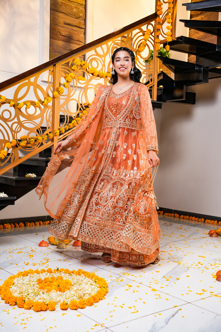 Pumpkin orange long coat style dress, beautifully adorned with silver embroidery and motif work. Designed with a stylish bottom split, a delicate net dupatta, and a matching embroidered pouch, this piece blends modern cuts with festive sophistication.