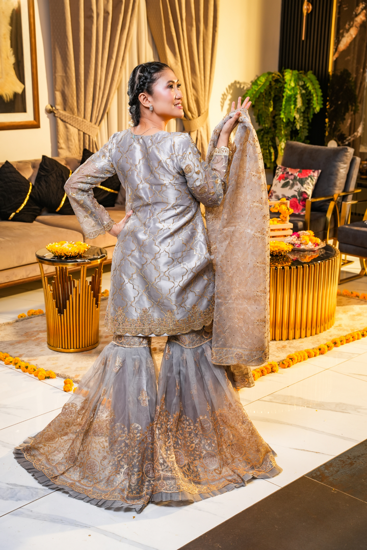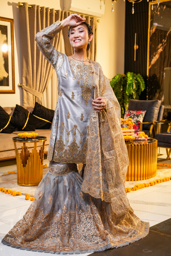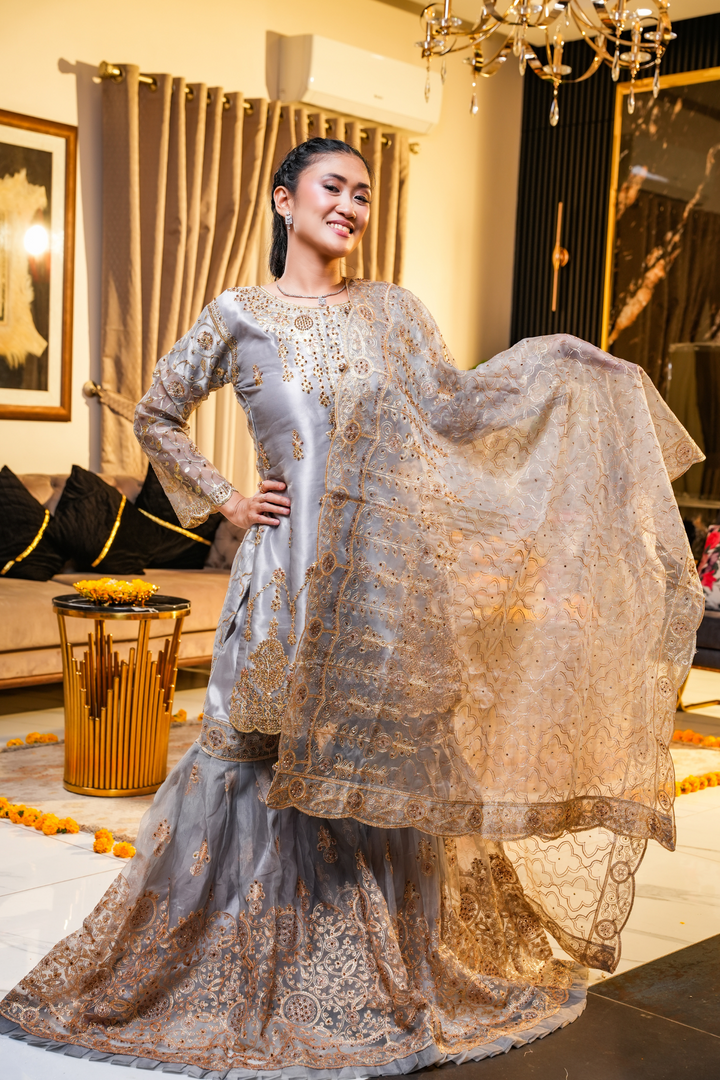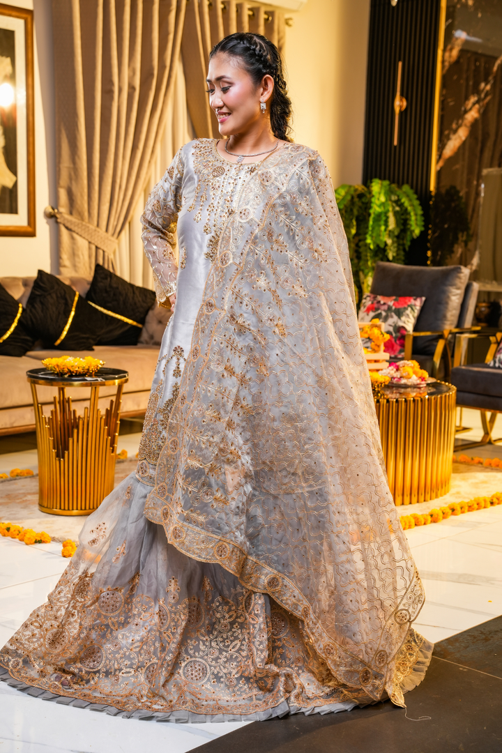 Designer Art’s Sitare Collection. Crafted in a silver tone with gold and copper embroidery, this ghagra set includes a finely detailed dress, embroidered sleeves, a soft net dupatta, and a matching pouch. Perfect for weddings, receptions, and grand celebrations.