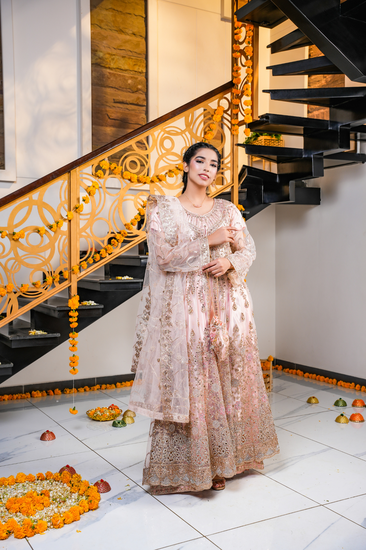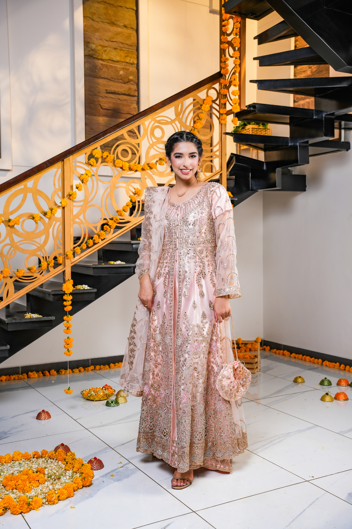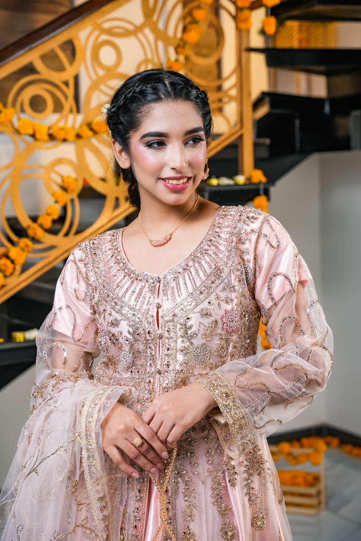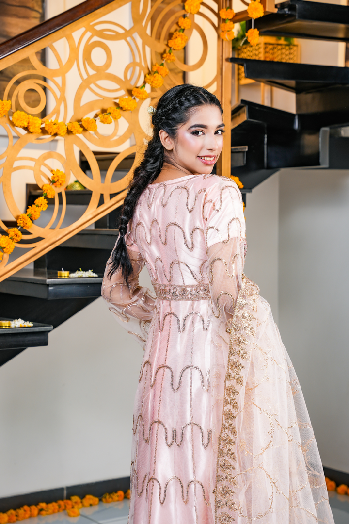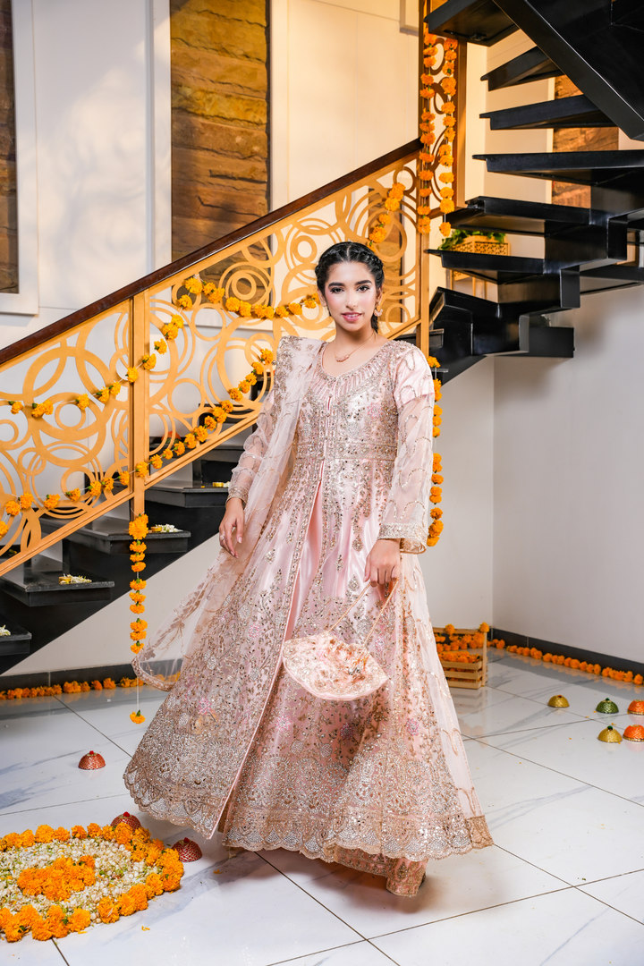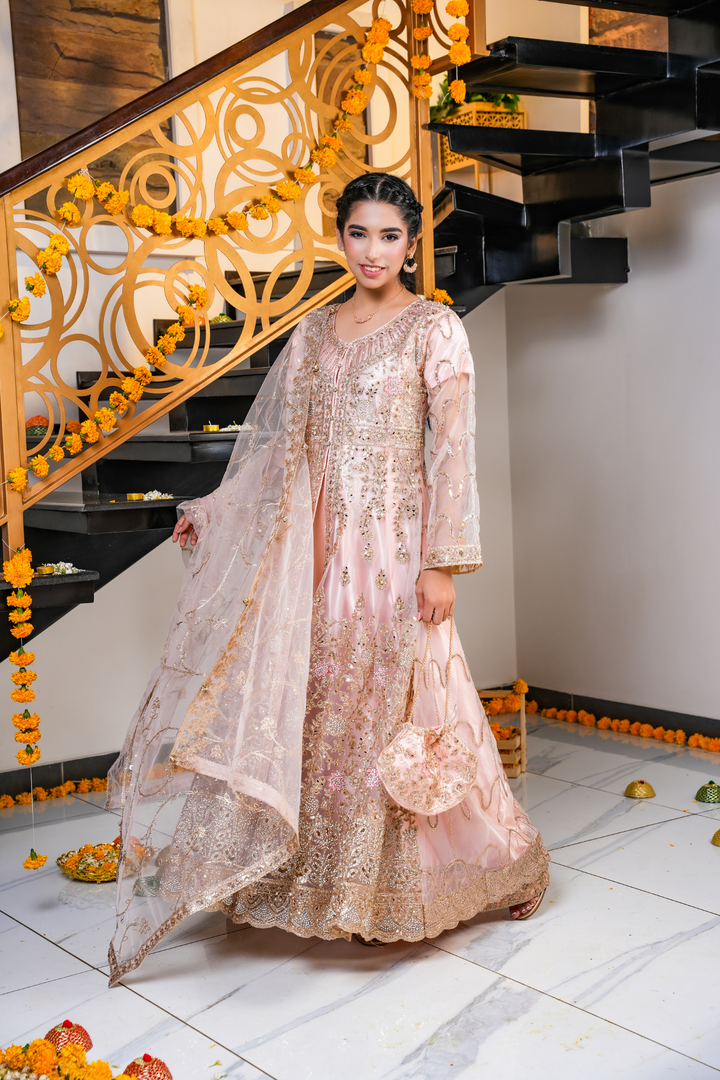 This peach pink outfit features delicate embroidery on the dress, net fabric dupatta, and matching pouch. Designed with a graceful split-cut bottom, it blends modern charm with traditional elegance, perfect for weddings, festive gatherings, and celebrations.
