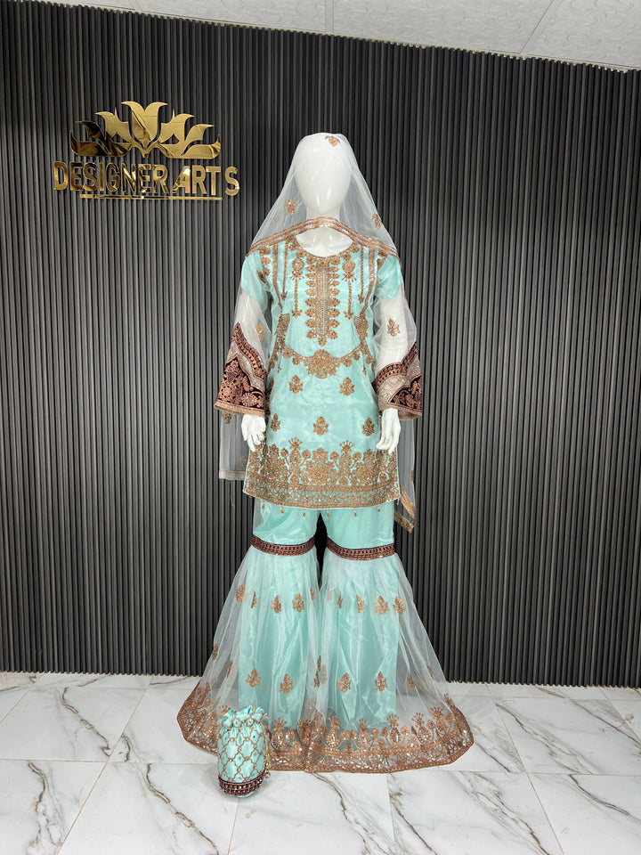 Sitare Collection. Designed in Tortoise Blue, this ghagra set features detailed embroidery across the dress, sleeves, dupatta, and matching pouch. The split cut style adds ease of movement, while the net dupatta completes the festive look.